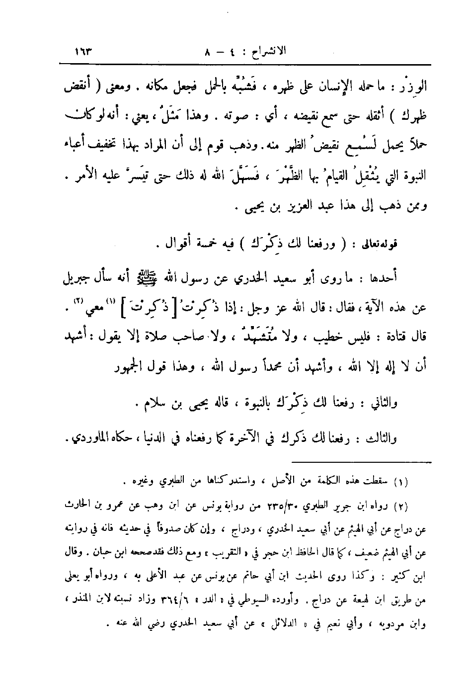قوله تعالى ورفعنا لك ذكرك فيه خمسة أقوال ما روى أبو سعيد الخدري عن رسول ص - أنه سأل جبريل عن هذه الآية فقال قال الله عز و جل إذا ذكرت ذكرت معي قال قتادة فليس خطيب ولا متشهد ولا صاحب صلاة إلا يقول أشهد أن لا إله إلا الله وأشهد أن محمدا رسول الله وهذا قول الجمهور