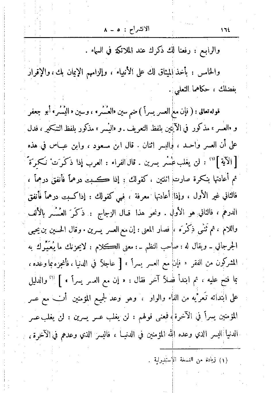 قوله تعالى فإن مع العسر يسرا ضم سين العسر وسين اليسر أبو جعفر و العسر مذكور في الآيتين بلفظ التعريف و اليسر مذكور بلفظ التنكير فدل على أن العسر واحد واليسر اثنان قال ابن مسعود وابن عباس في هذه الآية لن يغلب عسر يسرين قال الفراء العرب إذا ذكرت نكرة ثم أعادتها بنكرة صارت اثنتين كقولك إذا كسبت درهما فأنفق درهما فالثاني غير الأول وإذا أعادتها معرفة فهي كقولك إذا كسبت درهما فأنفق الدرهم فالثاني هو الأول ونحو هذا قال الزجاج ذكر العسر بالألف واللام ثم ثنى ذكره فصار المعنى إن مع العسر يسرين وقال الحسين بن يحيى الجرجاني ويقال له صاحب النظم معنى الكلام لا يحزنك ما يعيرك به المشركون من الفقر فإن مع العسر يسرا عاجلا في الدنيا فأنجزه بما وعده بما فتح عليه ثم ابتدأ فصلا آخر فقال إن مع العسر يسرا والدليل على ابتدائه تعريه من الفاء والواو وهو وعد لجميع المؤمنين أن مع عسر المؤمنين يسرا في الآخرة فمعنى قولهم لن يغلب عسر يسرين لن يغلب عسر الدنيا اليسر الذي وعده الله المؤمنين في الدنيا فاليسر الذي وعدهم في الآخرة