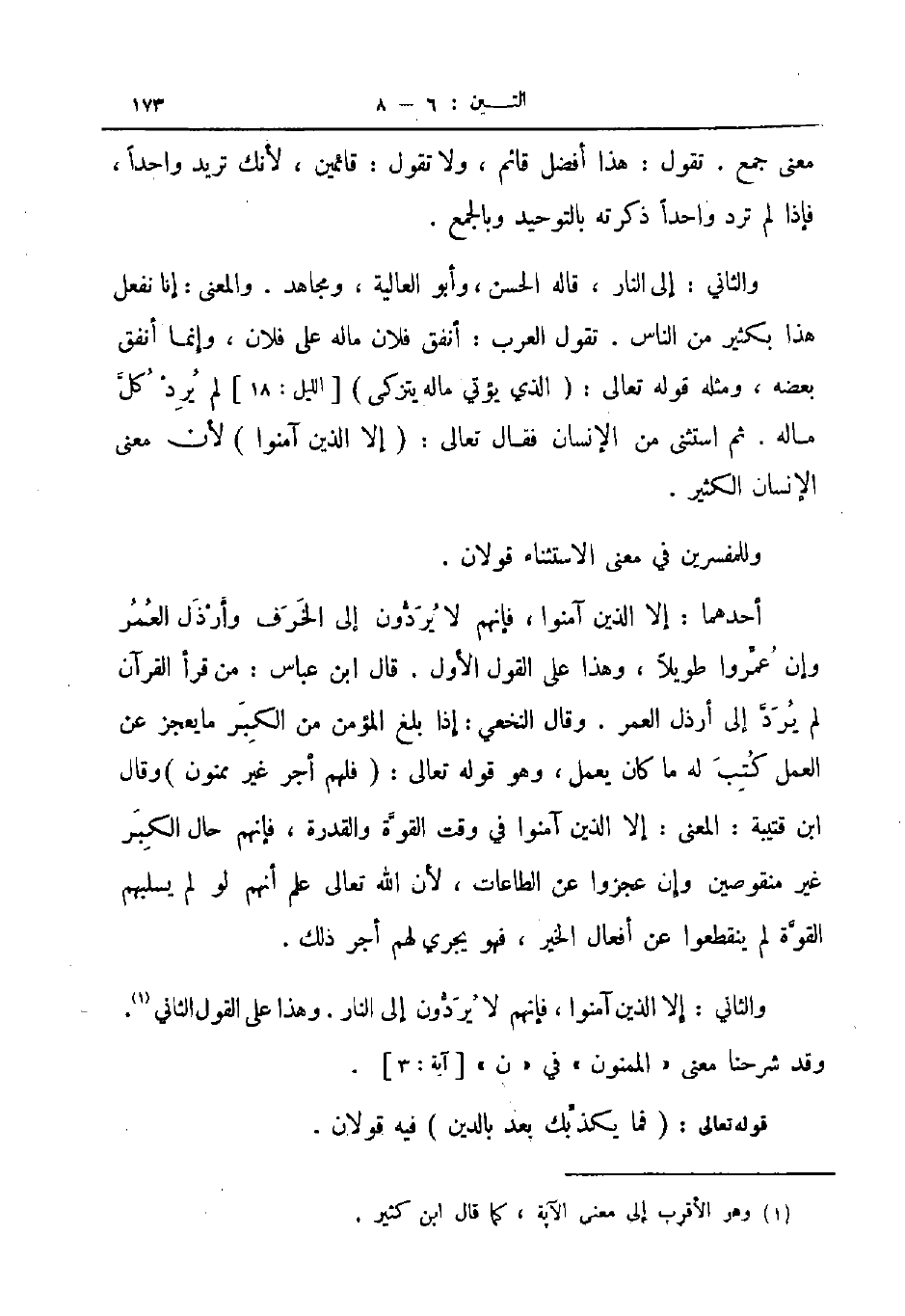 أحدهما إلا الذين آمنوا فإنهم لا يردون الى الخرف وأرذل العمر وإن عمروا طويلا وهذا على القول الأول قال ابن عباس من قرأ القرآن لم يرد الى ارذل العمر وقال النخعي إذا بلغ المؤمن من الكبر ما يعجز عن العمل كتب له ما كان يعمل وهو قوله تعالى فلهم أجر غير ممنون وقال ابن قتيبة المعنى إلا الذين آمنوا في وقت القوة والقدرة فإنهم حال الكبر غير منقوصين وإن عجزوا عن الطاعات لأن الله تعالى علم أنهم لو لم يسلبهم القوة لم ينقطعوا عن أفعال الخير فهو يجري لهم أجر ذلك