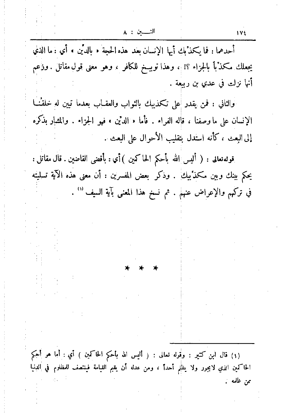 قوله تعالى أليس الله بأحكم الحاكمين أي بأقضى القاضين قال مقاتل يحكم بينك وبين مكذبيك وذكر بعض المفسرين أن معنى هذه الآية تسليته في تركهم والإعراض عنهم ثم نسخ هذا المعنى بآية السيف