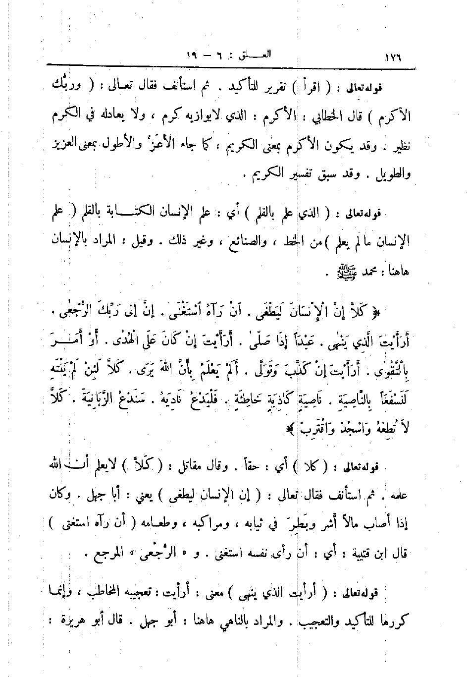كلا إن الإنسان ليطغى ان رآه استغنى إن إلى ربك الرجعى أرأيت الذي ينهى عبدا إذا صلى أرأيت إن كان على الهدى أو أمر بالتقوى أرأيت إن كذب وتولى ألم يعلم بأن الله يرى كلا لئن لم ينته لنسفعا بالناصية ناصية كاذبة خاطئة فليدع ناديه سندع الزبانية كلا لا تطعه واسجد واقترب
