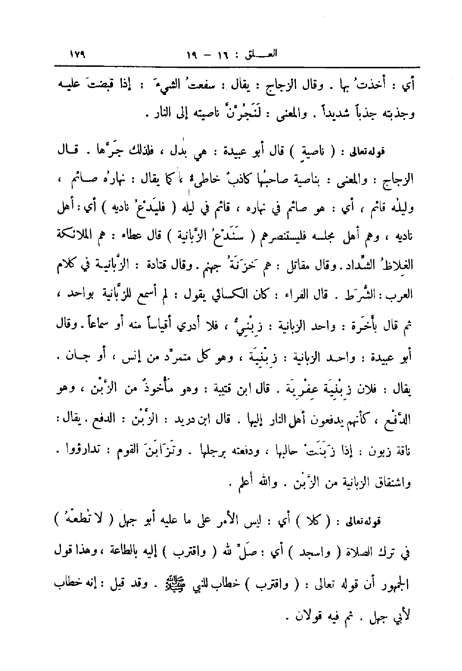 قوله تعالى ناصية قال أبو عبيدة هي بدل فلذلك جرها قال الزجاج والمعنى بناصية صاحبها كاذب خاطىء كما يقال نهاره صائم وليله قائم أي هو صائم في نهاره قائم في ليله فليدع ناديه أي أهل ناديه وهم أهل مجلسه فليستنصرهم سندع الزبانية قال عطاء هم الملائكة الغلاظ الشداد وقال مقاتل هم خزنة جهنم وقال قتادة الزبانية في كلام العرب الشرط قال الفراء كان الكسائي يقول لم أسمع للزبانية بواحد ثم قال بأخرة واحد الزبانية زبني فلا أدري أقياسا منه أو سماعا وقال أبو عبيدة واحد الزبانية زبنية وهو كل متمرد من إنس أو جان يقال فلان زبنية عفرية قال ابن قتيبة وهو مأخوذ من الزين وهو الدفع كأنهم يدفعون أهل النار إليها قال ابن دريد الزبن الدفع يقال ناقة زبون إذا زبنت حالبها ودفعته برجلها وتزابن القوم تدارؤوا وإشتقاق الزبانية من الزبن والله أعلم