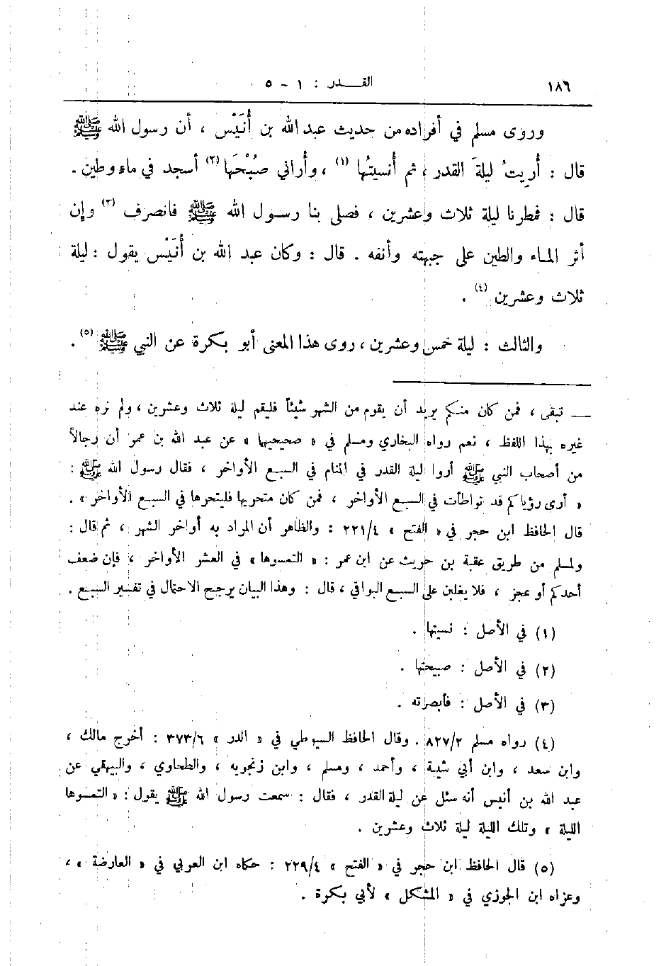 وروى مسلم في أفراده من حديث عبد الله بن أنيس أن رسول الله صلى الله عليه و سلم قال أريت ليلة القدر ثم أنسيتها وأراني صبحها أسجد في ماء وطين قال فمطرنا ليلة ثلاث وعشرين فصلى بنا رسول الله صلى الله عليه و سلم فانصرف وإن أثر الماء والطين على جبهته وأنفه قال وكان عبد الله بن أنيس يقول ليلة ثلاث وعشرين