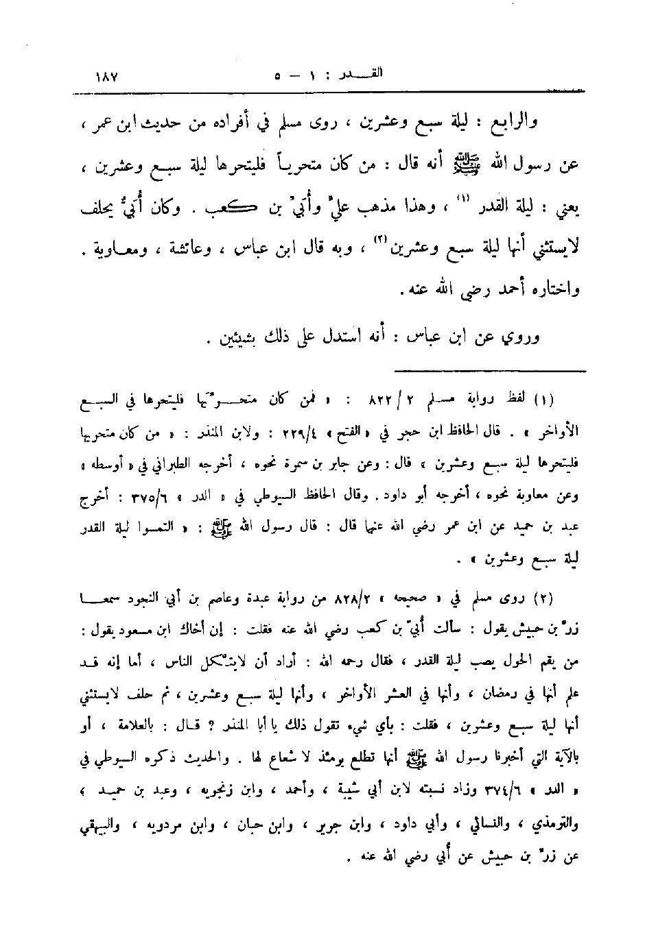 والرابع ليلة سبع وعشرين روى مسلم في أفراده من حديث ابن عمر عن رسول الله صلى الله عليه و سلم أنه قال من كان متحريا فليتحرها ليلة سبع وعشرين يعني ليلة القدر وهذا مذهب علي وأبي بن كعب وكان أبي يحلف لا يستثني أنها ليلة سبع وعشرين وبه قال ابن عباس وعائشة ومعاوية واختاره أحمد رضي الله عنه