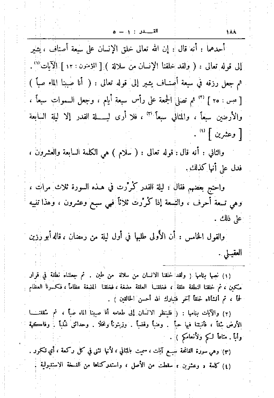 أحدهما أنه قال إن الله تعالى خلق الإنسان على سبعة أصناف يشير الى قوله تعالى ولقد خلقنا الإنسان من سلالة المؤمنين 12 الآيات ثم جعل رزقه في سبعة أصناف يشير الى قوله تعالى أنا صببنا الماء صبا عبس 25 ثم تصلى الجمعة على رأس سبعة أيام وجعل السموات سبعا والأرضين سبعا والمثاني سبعا فلا أرى ليلة القدر إلا ليلة السابعة وعشرين