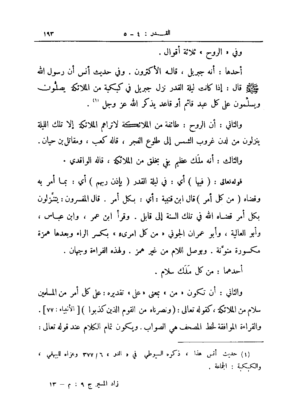 أحدها أنه جبريل قاله الأكثرون وفي حديث أنس أن رسول الله صلى الله عليه و سلم قال إذا كانت ليلة القدر نزل جبريل في كبكبة من الملائكة يصلون ويسلمون على كل عبد قائم أو قاعد يذكر الله عز و جل