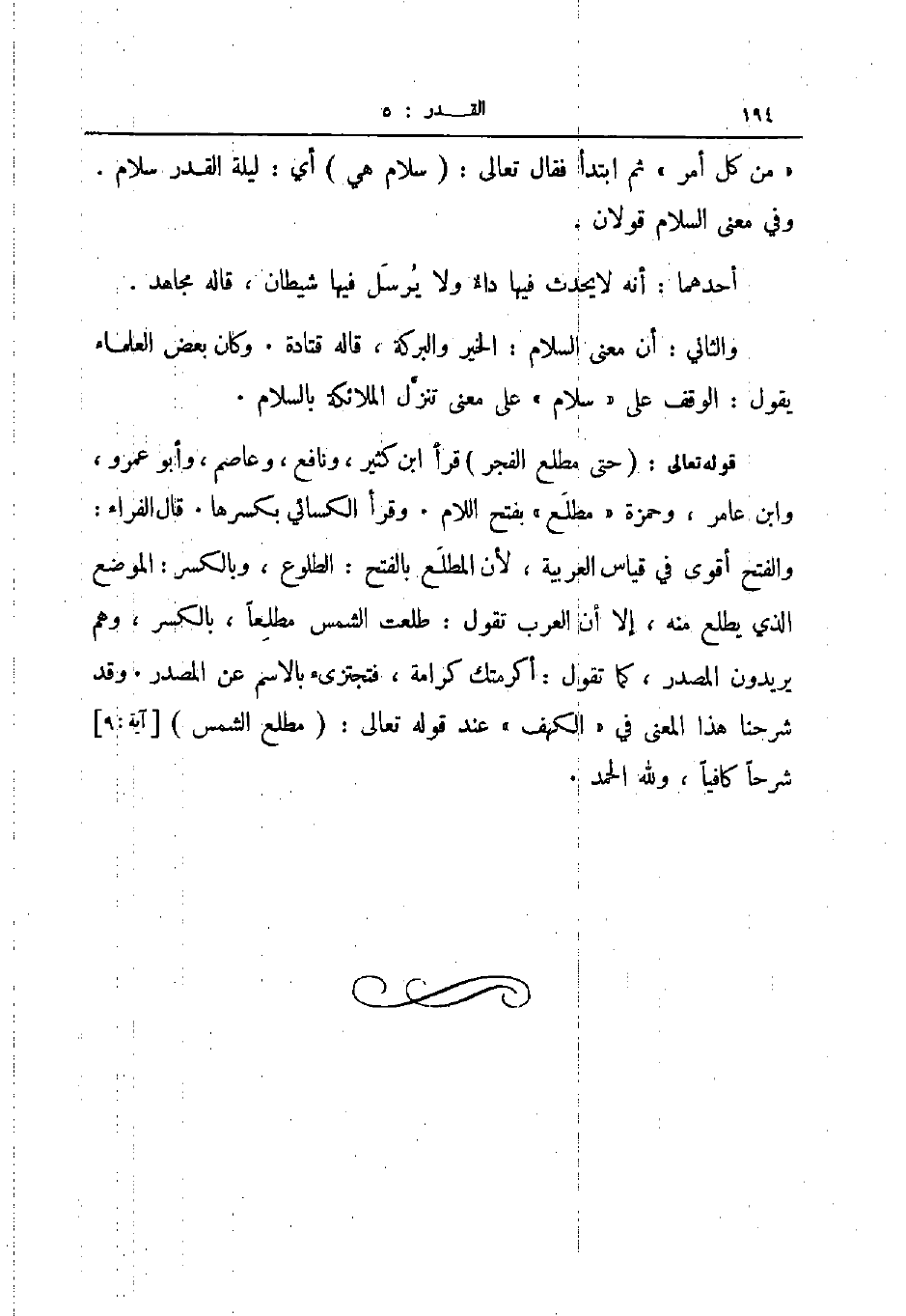 قوله تعالى حتى مطلع الفجر قرأ ابن كثير ونافع وعاصم وأبو عمرو وابن عامر وحمزة مطلع بفتح اللام وقرأ الكسائي بكسرها قال الفراء والفتح أقوى في قياس العربية لأن المطلع بالفتح الطلوع وبالكسر الموضع الذي يطلع منه إلا أن العرب تقول طلعت الشمس مطلعا بالكسر وهم يريدون المصدر كما تقول أكرمتك كرامة فتجتزيء بالأسم عن المصدر وقد شرحنا هذا المعنى في الكهف عند قوله تعالى مطلع الشمس آية 9 شرحا كافيا ولله الحمد