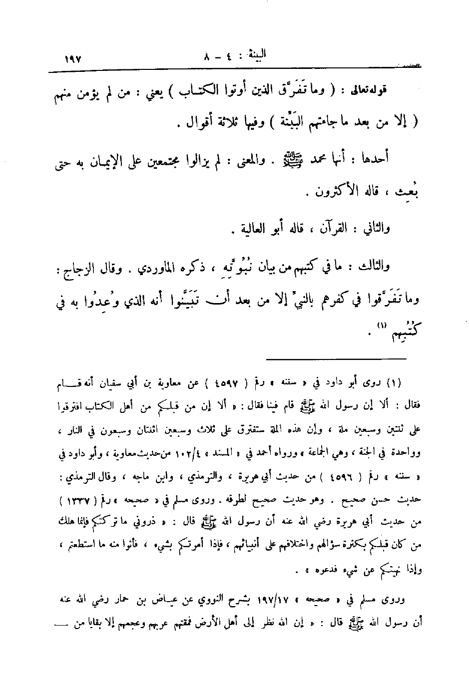 قوله تعالى وما تفرق الذين أوتوا الكتاب يعني من لم يؤمن منهم إلا من بعد ما جاءتهم البينة وفيها ثلاثة أقوال