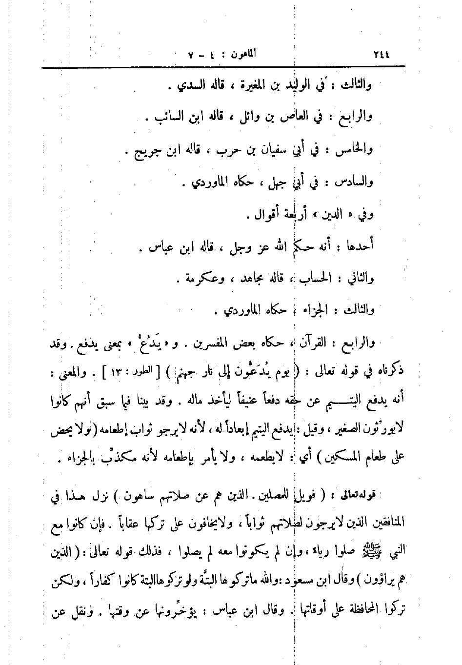 قوله تعالى فويل للمصلين الذين هم عن صلاتهم ساهون نزل هذا في المنافقين الذين يرجون لصلاتهم ثوابا ولا يخافون على تركها عقابا فإن كانوا مع النبي صلى الله عليه و سلم صلوا رياء وإن لم يكونوا معه لم يصلوا فذلك قوله تعالى الذين هم يراؤون وقال ابن مسعود والله ما تركوها البتة ولو تركوها البتة كانوا كفارا ولكن تركوا المحافظة على أوقاتها وقال ابن عباس يؤخرونها عن وقتها ونقل عن