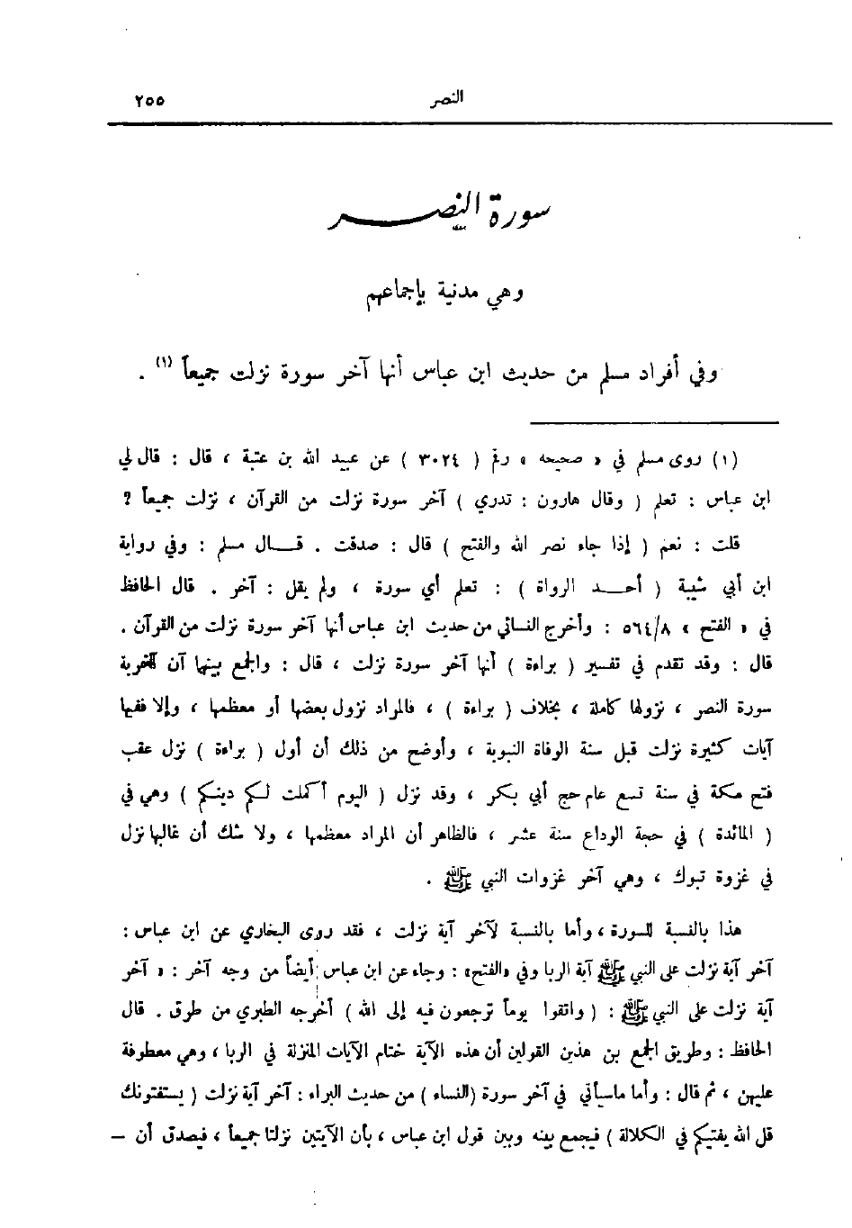 وفي أفراد مسلم من حديث ابن عباس أنها آخر سورة نزلت جميعا