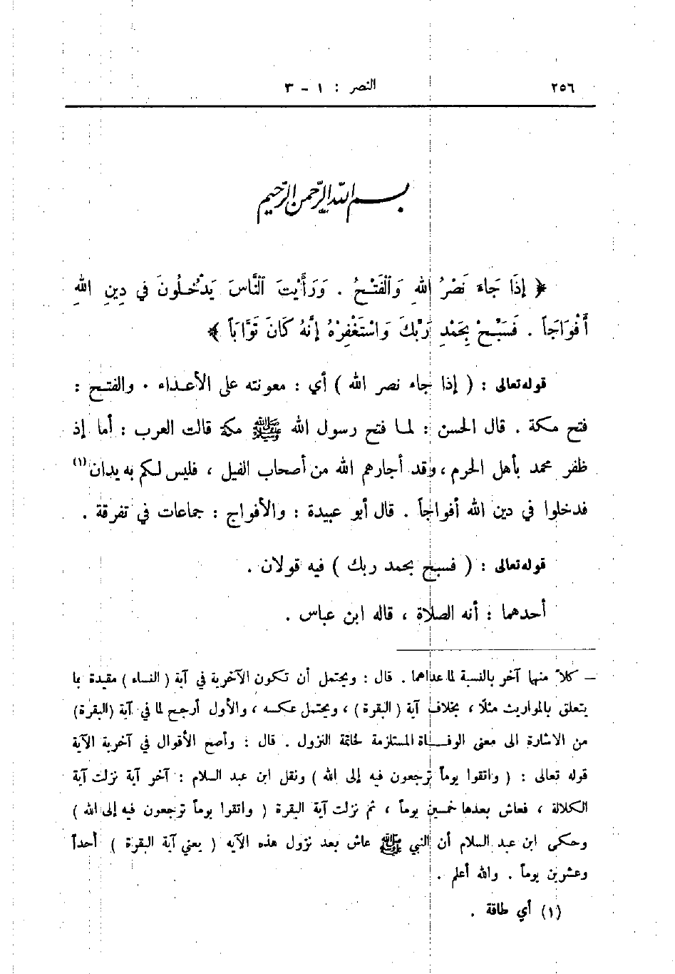 قوله تعالى إذا جاء نصر الله أي معونته على الأعداء والفتح فتح مكة قال الحسن لما فتح رسول الله صلى الله عليه و سلم مكة قالت العرب أما إذ ظفر محمد بأهل الحرم وقد أجارهم الله من أصحاب الفيل فليس لكم به يدان فدخلوا في دين الله أفواجا قال أبو عبيدة والأفواج جماعات في تفرقة