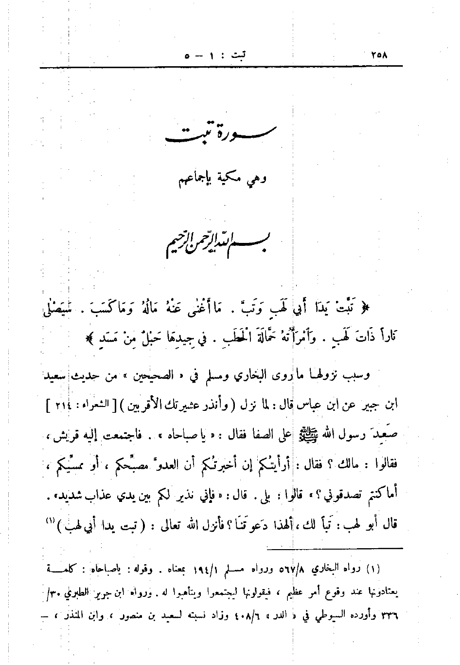 وسبب نزولها ما روى البخاري ومسلم في الصحيحين من حديث سعيد ابن جبير عن ابن عباس قال لما نزل وأنذر عشيرتك الأقربين الشعراء 214 صعد رسول الله صلى الله عليه و سلم على الصفا فقال يا صباحاه فاجتمعت إليه قريش فقالوا ما لك فقال أرأيتكم إن أخبرتكم أن العدو مصبحكم أو ممسيكم أما كنتم تصدقوني قالوا بلى قال فإني نذير لكم بين يدي عذاب شديد