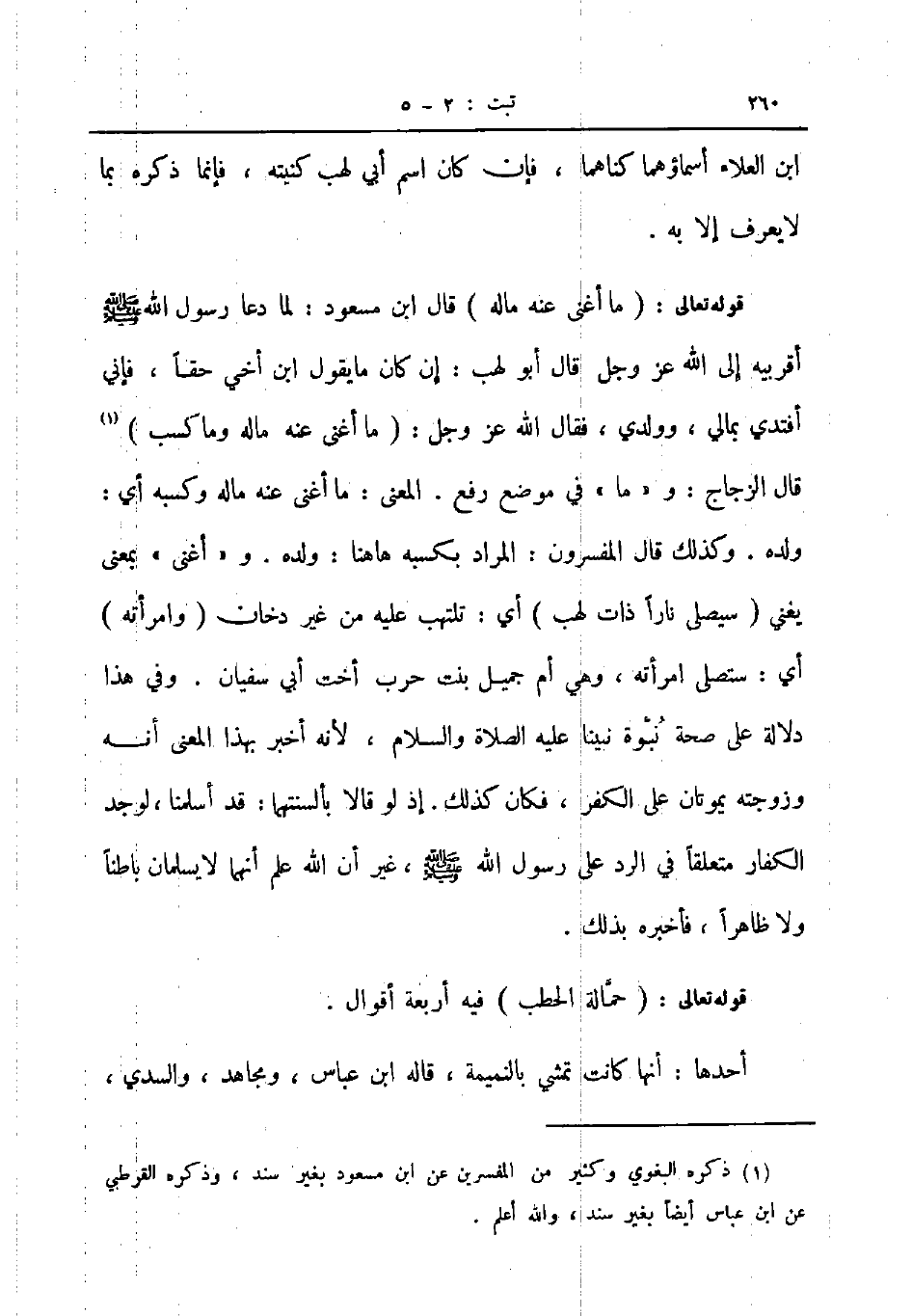 قوله تعالى ما أغنى عنه ماله قال ابن مسعود لما دعا رسول الله صلى الله عليه و سلم أقربيه إلى الله عز و جل قال أبو لهب إن كان ما يقول ابن أخي حقا فإني أفتدي بمالي وولدي فقال الله عز و جل ما أغنى عنه ماله و كسب قال الزجاج و ما في موضع رفع المعنى ما أغنى عنه ماله و كسبه أي ولده وكذلك قال المفسرون المراد بكسبه هاهنا ولده و أغنى بمعنى يغني سيصلى نارا ذات لهب أي تلتهب عليه من غير دخان وامرأته أي ستصلى امرأته وهي أم جميل بنت حرب أخت أبي سفيان وفي هذا دلالة على صحة نبوة نبينا عليه الصلاة و السلام لأنه أخبر بهذا المعنى أنه وزوجته يموتان على الكفر فكان كذلك إذ لو قالابألسنتهما قد أسلمنا لوجد الكفار متعلقا في الرد على رسول الله صلى الله عليه و سلم غير أن الله علم أنهما لا يسلمان باطنا ولا ظاهرا فأخبره بذلك