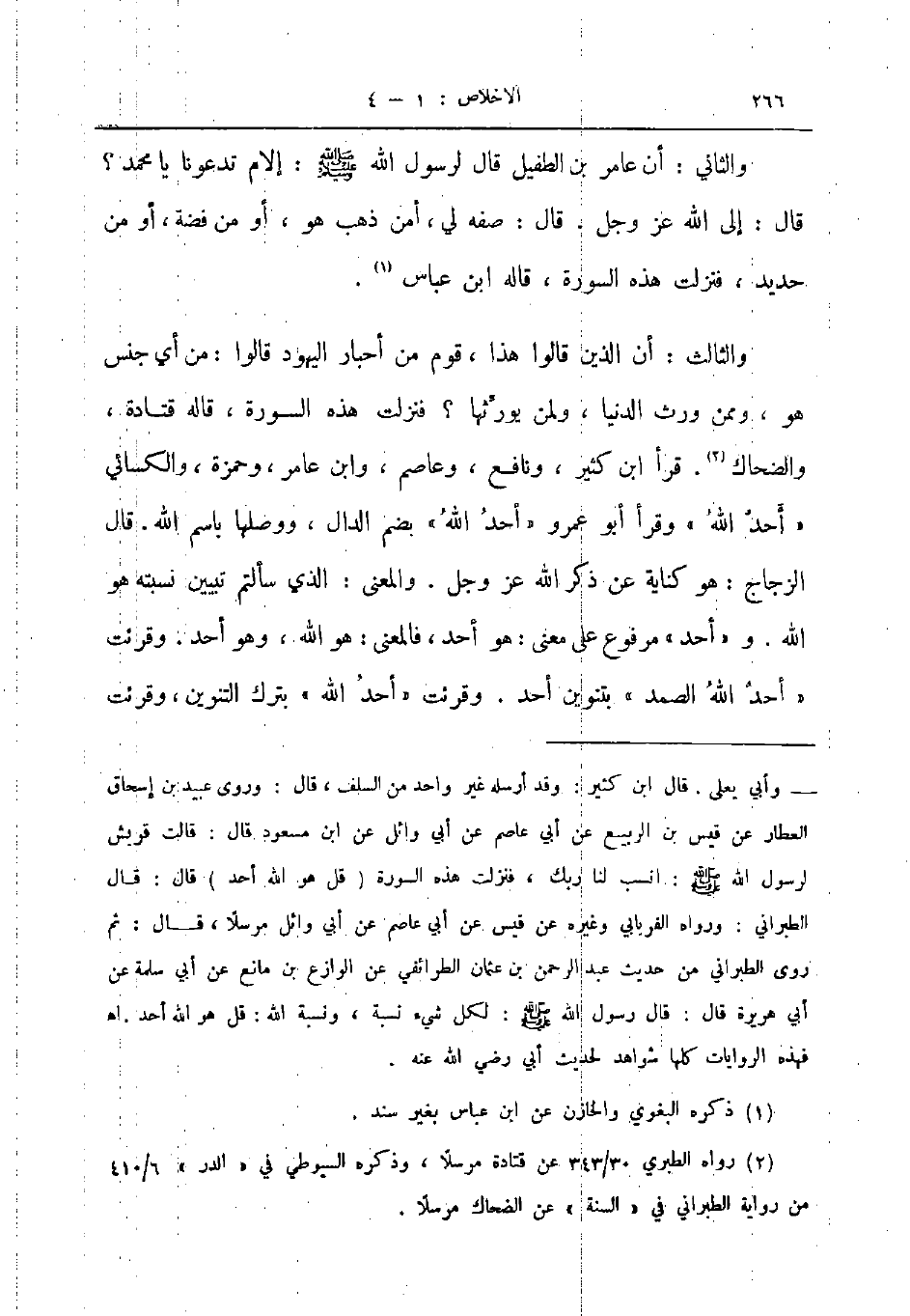 والثاني أن عامر بن الطفيل قال لرسول الله صلى الله عليه و سلم إلام تدعونا يا محمد قال الى الله عز و جل قال صفه لي أمن ذهب هو أو من فضة أو من حديد فنزلت هذه السورة قاله ابن عباس