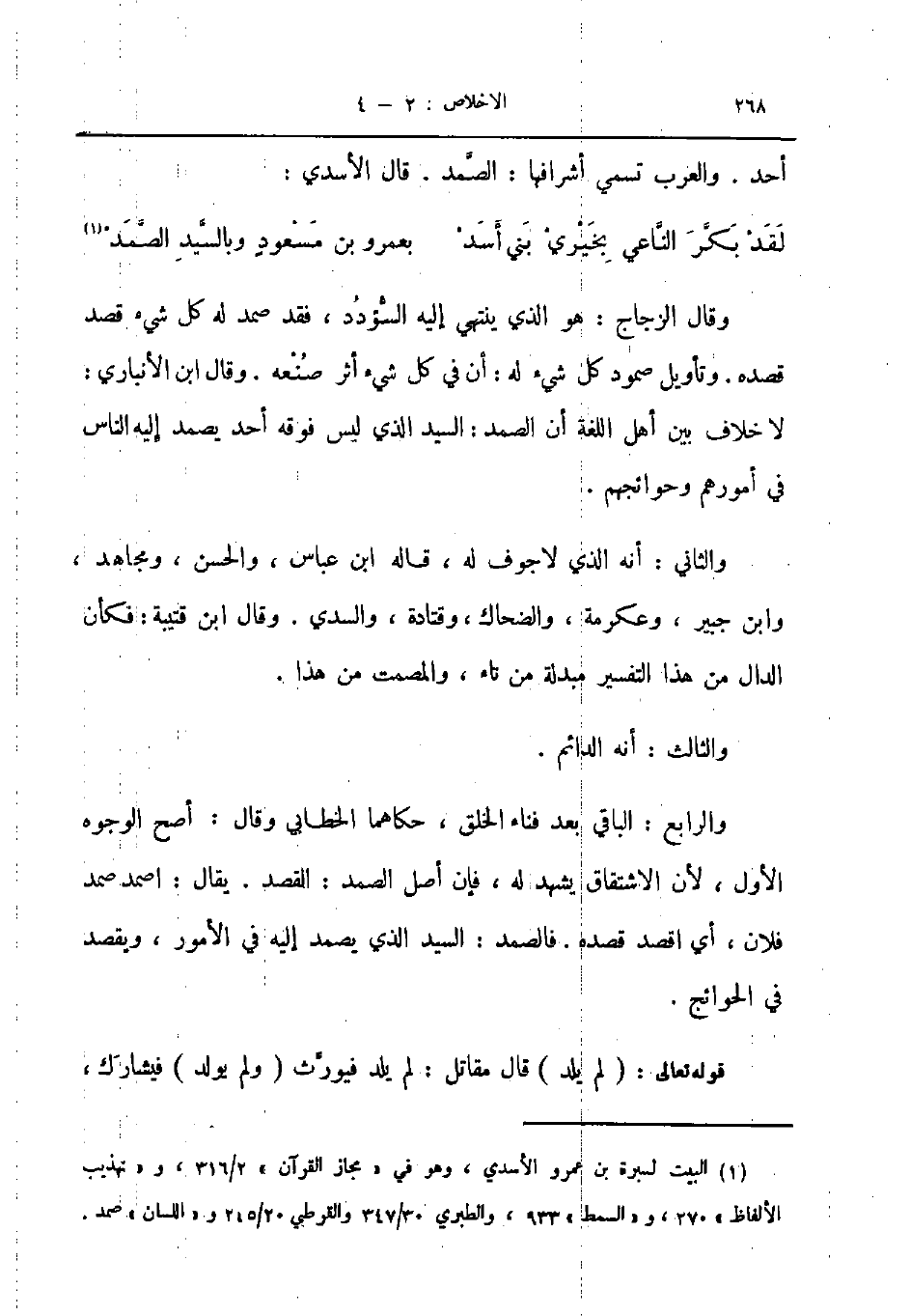 وقال الزجاج هو الذي ينتهي إليه السؤدد فقد صمد له كل شيء قصد قصده وتأويل صمود كل شيء له أن في كل شيء أثر صنعه وقال ابن الأنباري لا خلاف بين أهل اللغة أن الصمد السيد الذي ليس فوقه أحد يصمد إليه الناس في أمورهم وحوائجهم