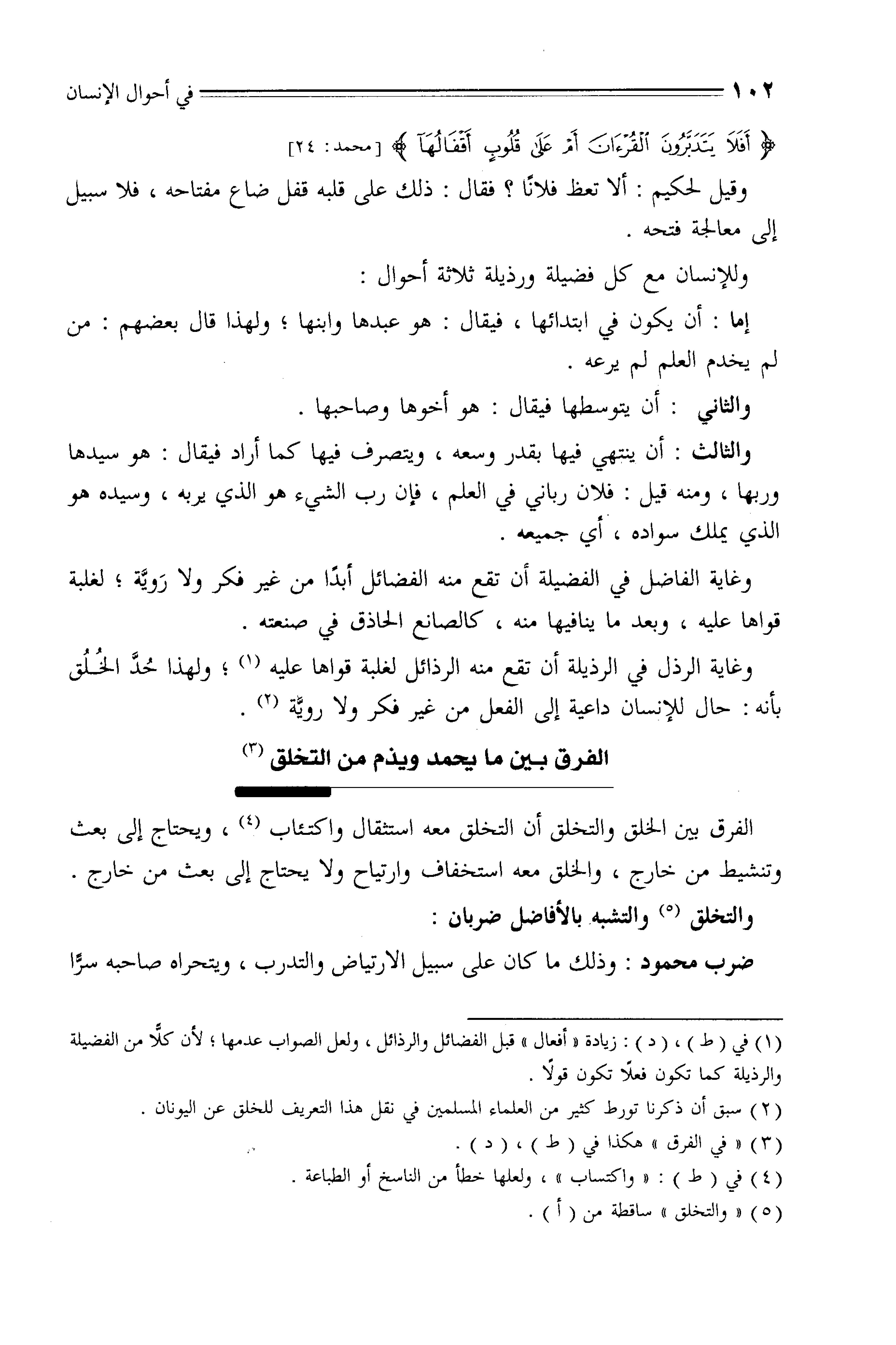 وللإنسان مع كل فضيلة ورذيلة ثلاثة أحوال: