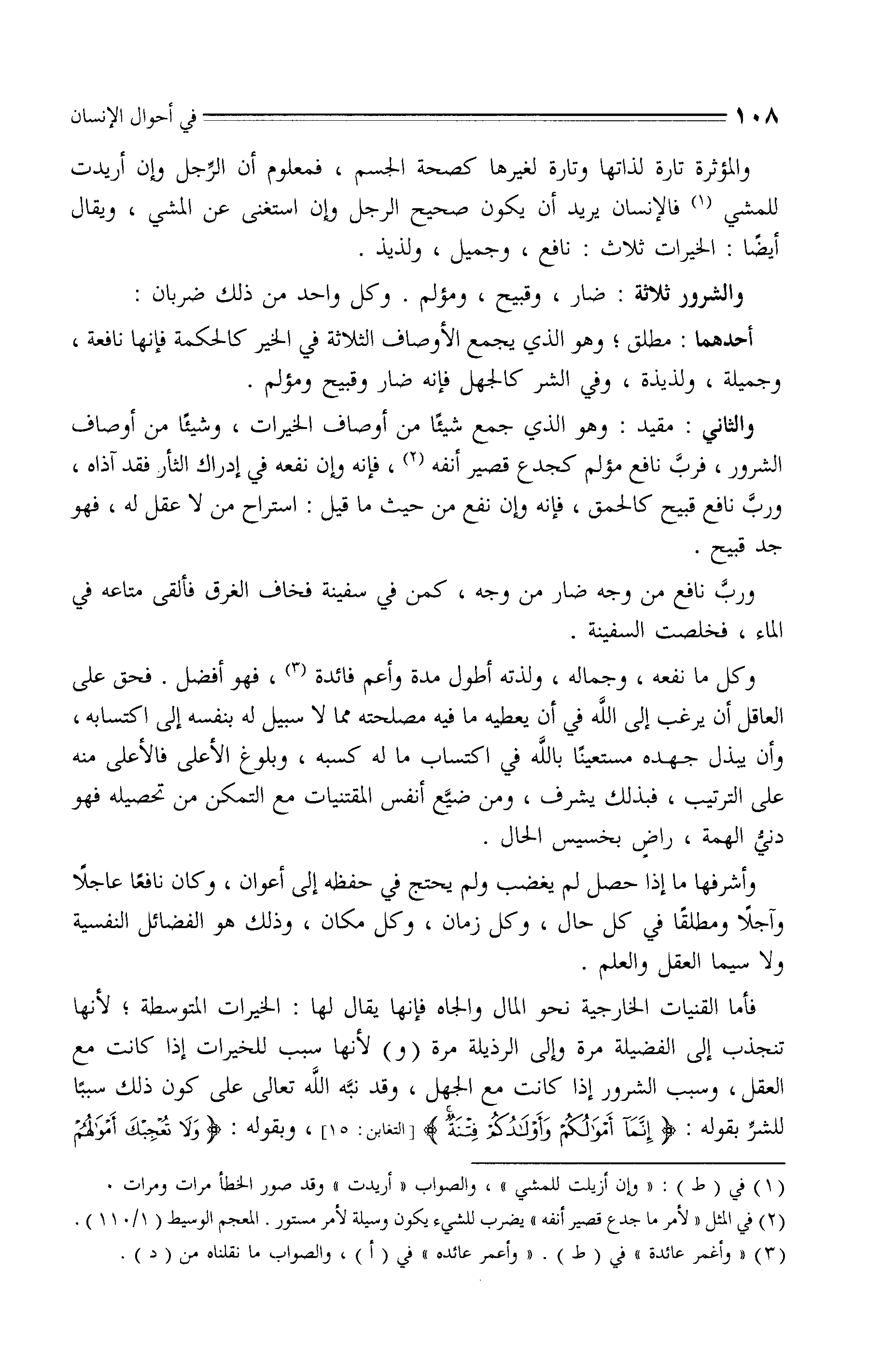 وأشرفها ما إذا حصل لم يغضب ولم يحتج في حفظه إلى أعوان، وكان نافعًا عاجلًا وآجلًا ومطلقا في كل حال، وكل زمان، وكل مكان، وذلك هو الفضائل النفسية ولا سيما العقل والعلم.