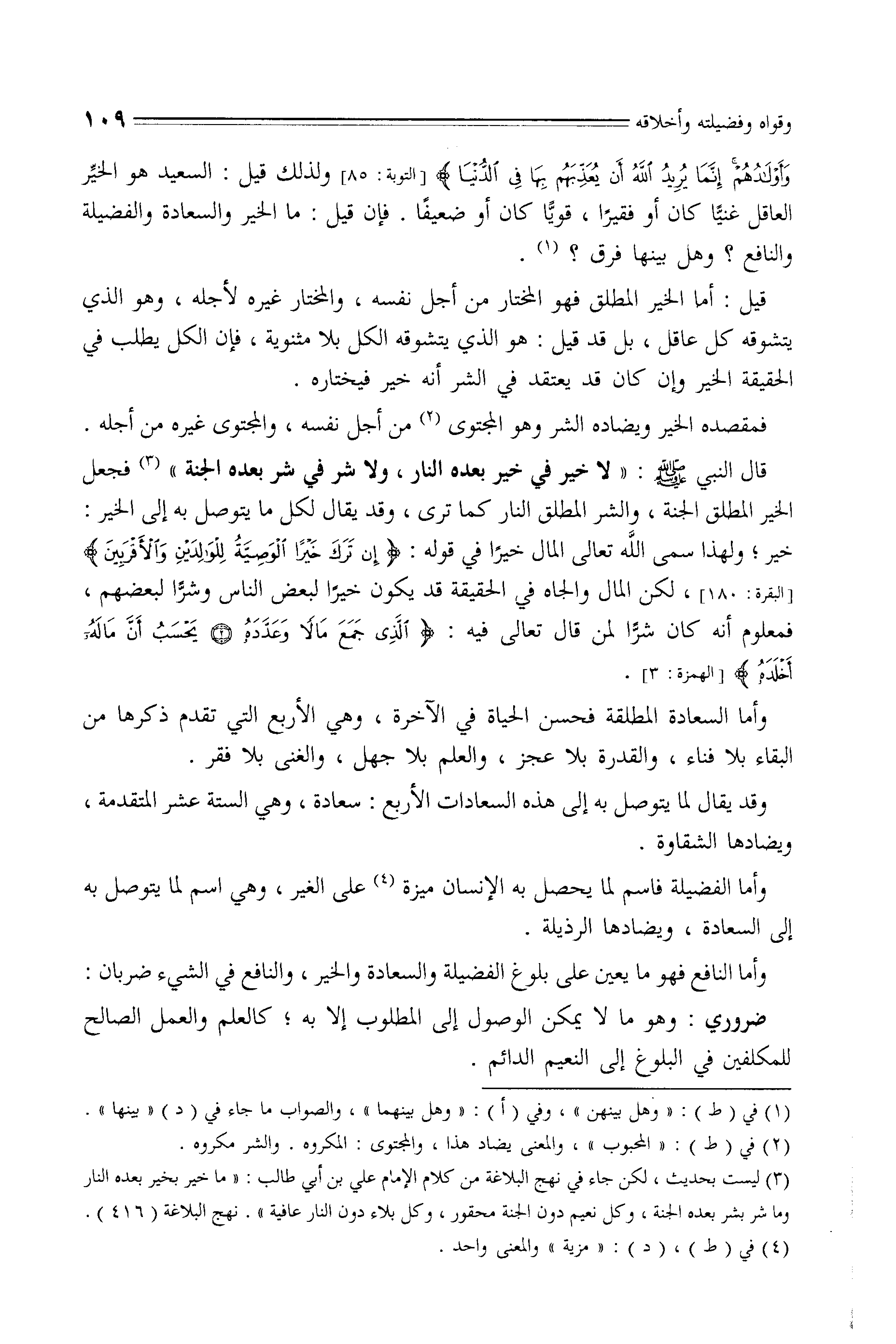 فإن قيل: ما الخير والسعادة والفضيلة والنافع، وهل بينها فرق،.