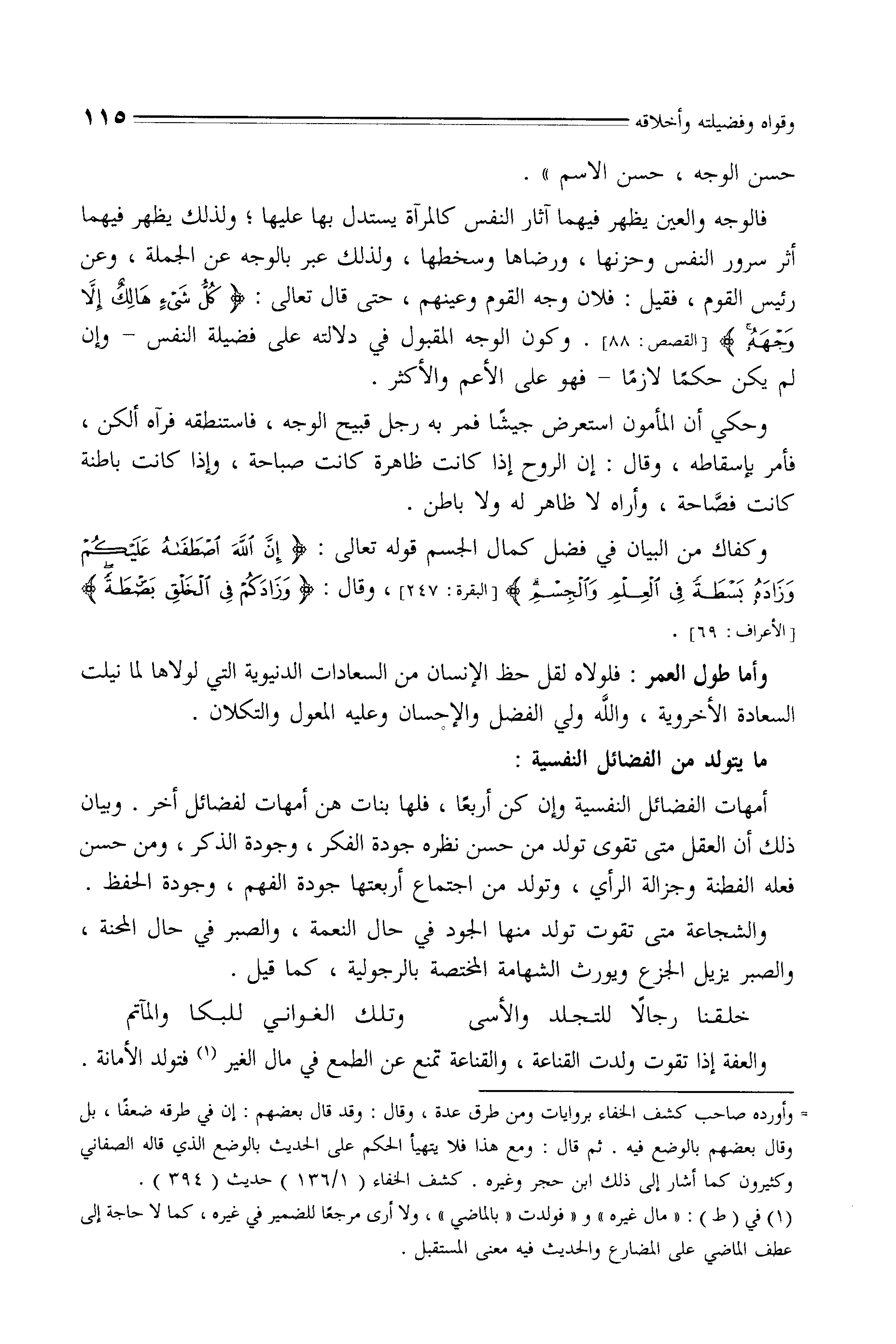 أمهات الفضائل النفسية وإن كن أربعا، فلها بنات هن أمهات لفضائل أخر. وبيان ذلك أن العقل متى تقوى تولد من حسن نظره جودة الفكر، وجودة الذكر، ومن حسن فعله الفطنة وجزالة الرأي، وتولد من اجتماع أربعتها جودة الفهم، وجودة الحفظ.