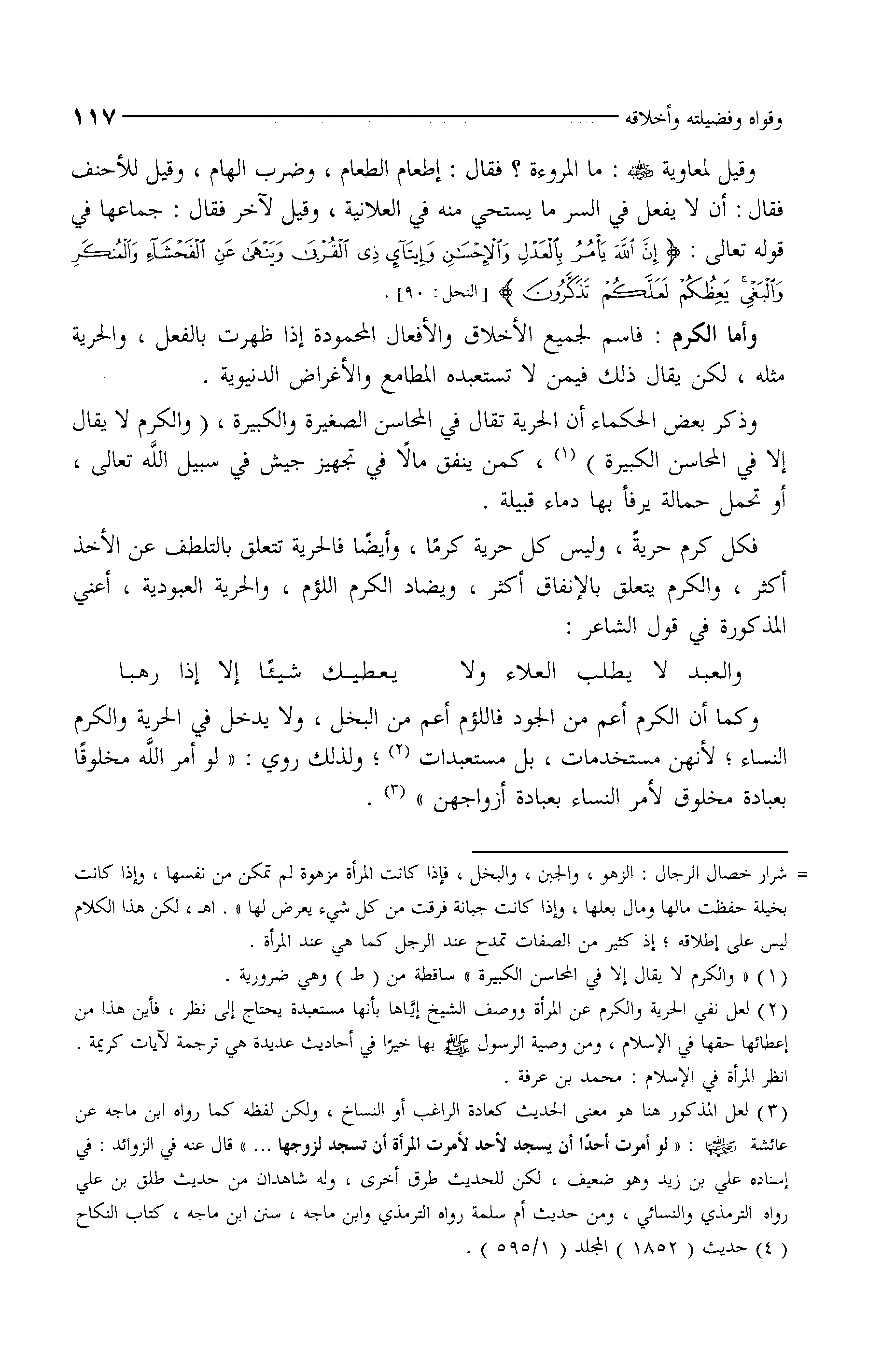 فقال: أن لا يفعل في السر ما يستحي منه في العلانية، وقيل لآخر فقال: جماعها في قوله تعالى: (إِنَّ اللَّهَ يَأْمُرُ بِالْعَدْلِ وَالْإِحْسَانِ وَإِيتَاءِ ذِي الْقُرْبَى وَيَنْهَى عَنِ الْفَحْشَاءِ وَالْمُنْكَرِ وَالْبَغْيِ يَعِظُكُمْ لَعَلَّكُمْ تَذَكَّرُونَ (90) .