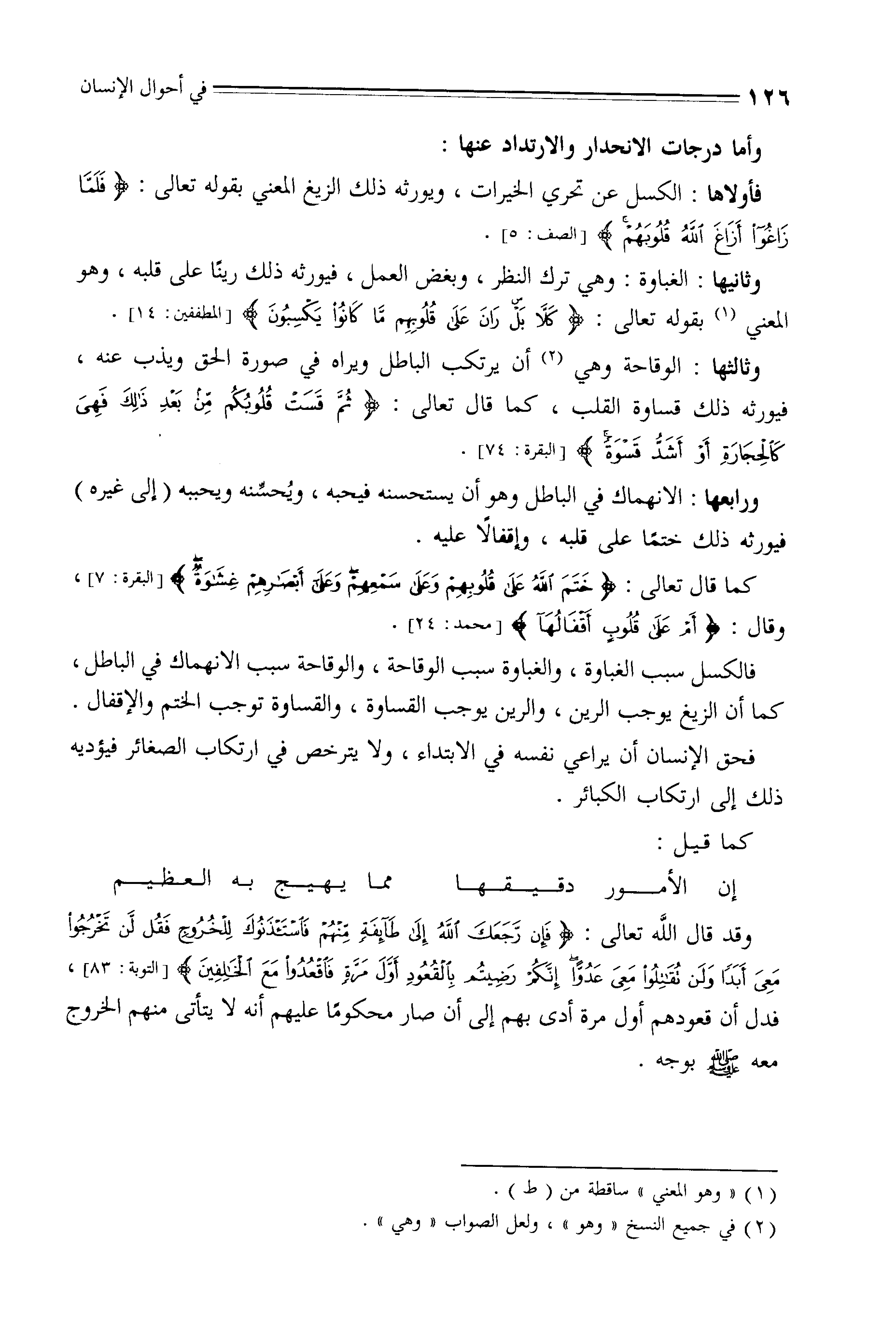 فأولاها: الكسل عن تحري الخيرات، ويورثه ذلك الزيغ المعني بقوله تعالى: (فَلَمَّا زَاغُوا أَزَاغَ اللَّهُ قُلُوبَهُمْ) .