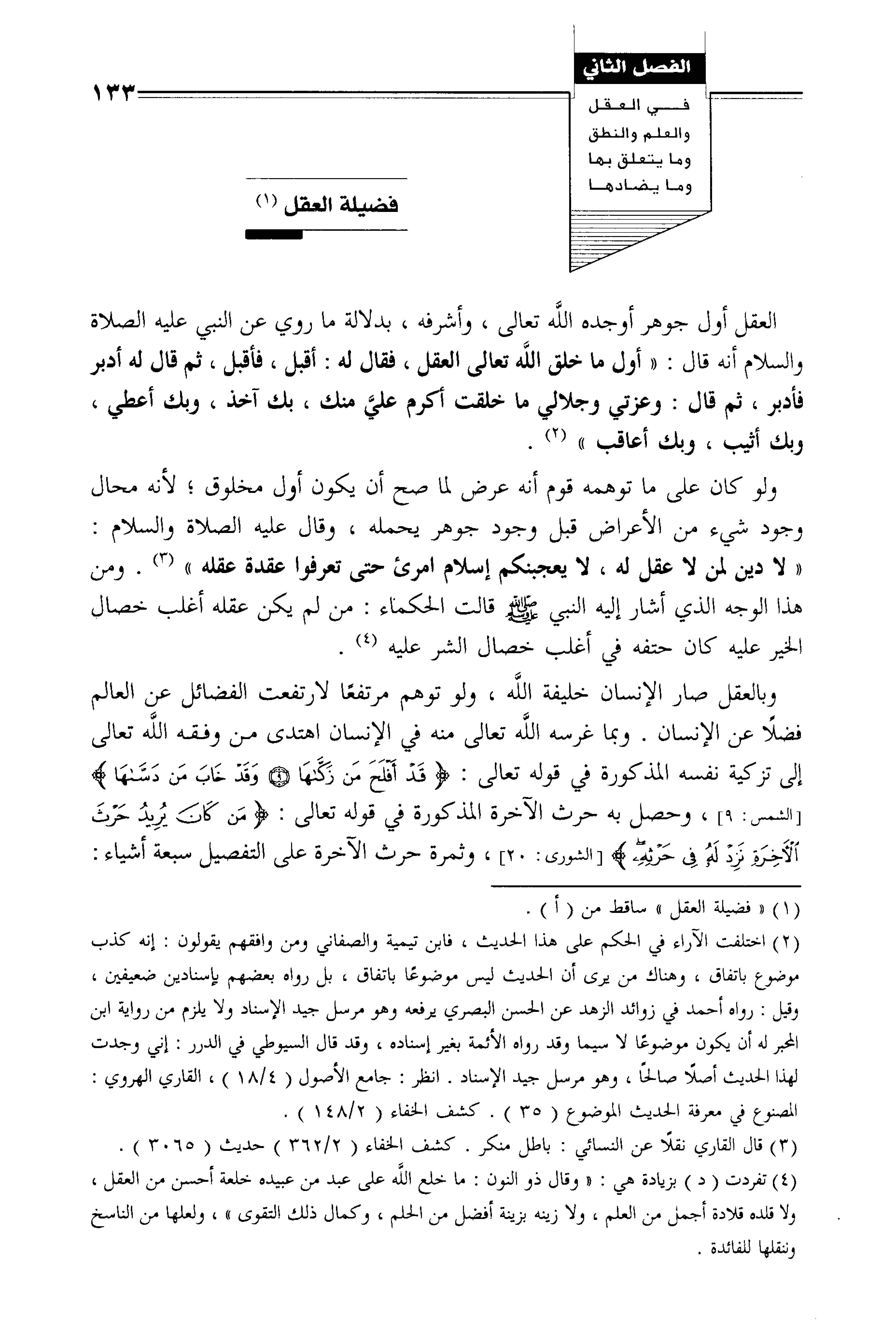 ولو كان على ما توهمه قوم أنه عرض لما صح أن يكون أول مخلوق، لأنه محال وجود شيء من الأعراض قبل وجود جوهر يحمله، وقال عليه الصلاة والسلام: " لا دين لمن لا عقل له، لا يعجبنكم إسلام امرئ حتى تعرفوا عقدة عقله ".