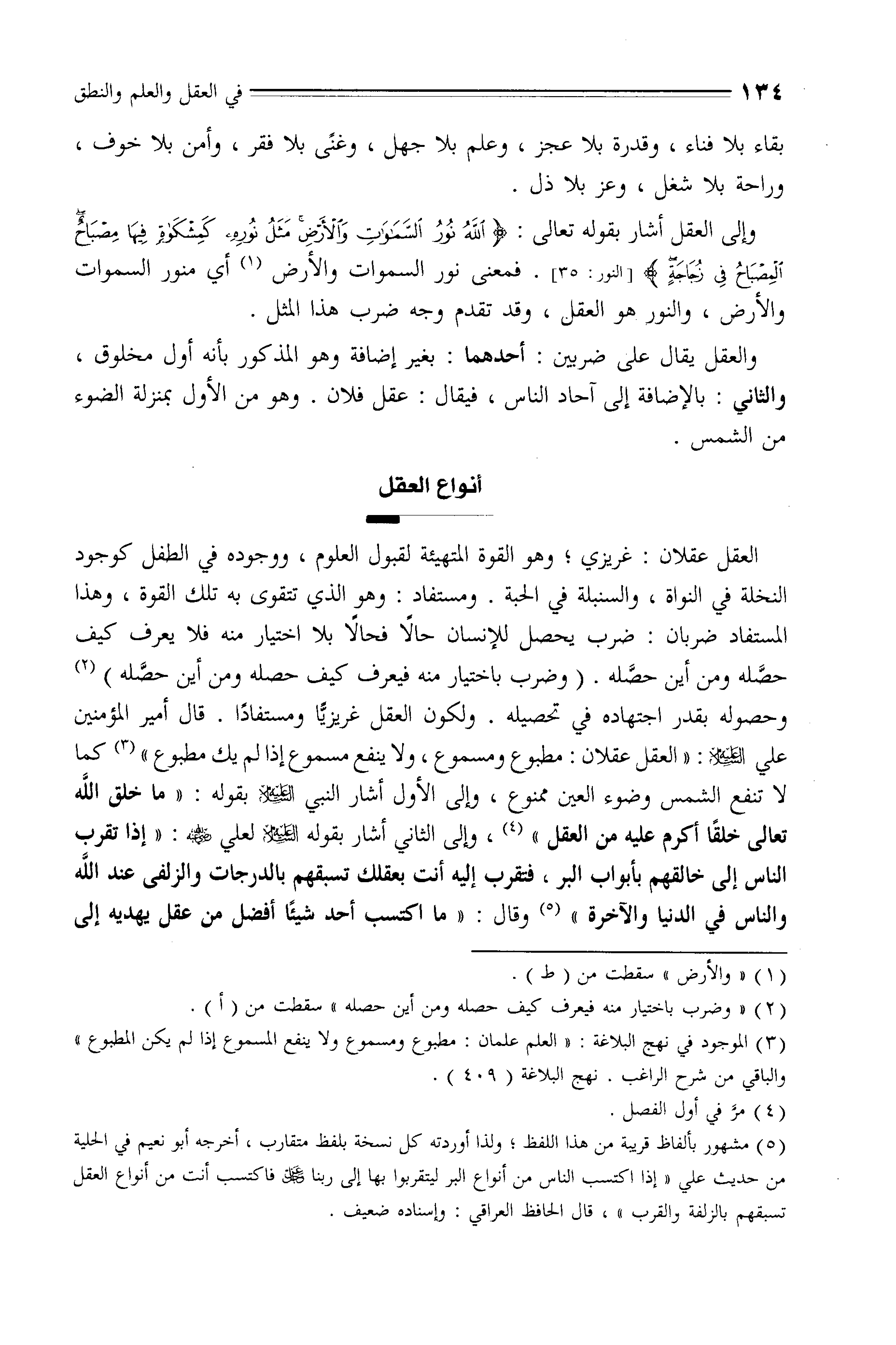 وإلى العقل أشار بقوله تعالى: (اللَّهُ نُورُ السَّمَاوَاتِ وَالْأَرْضِ مَثَلُ نُورِهِ كَمِشْكَاةٍ فِيهَا مِصْبَاحٌ الْمِصْبَاحُ فِي زُجَاجَةٍ) .