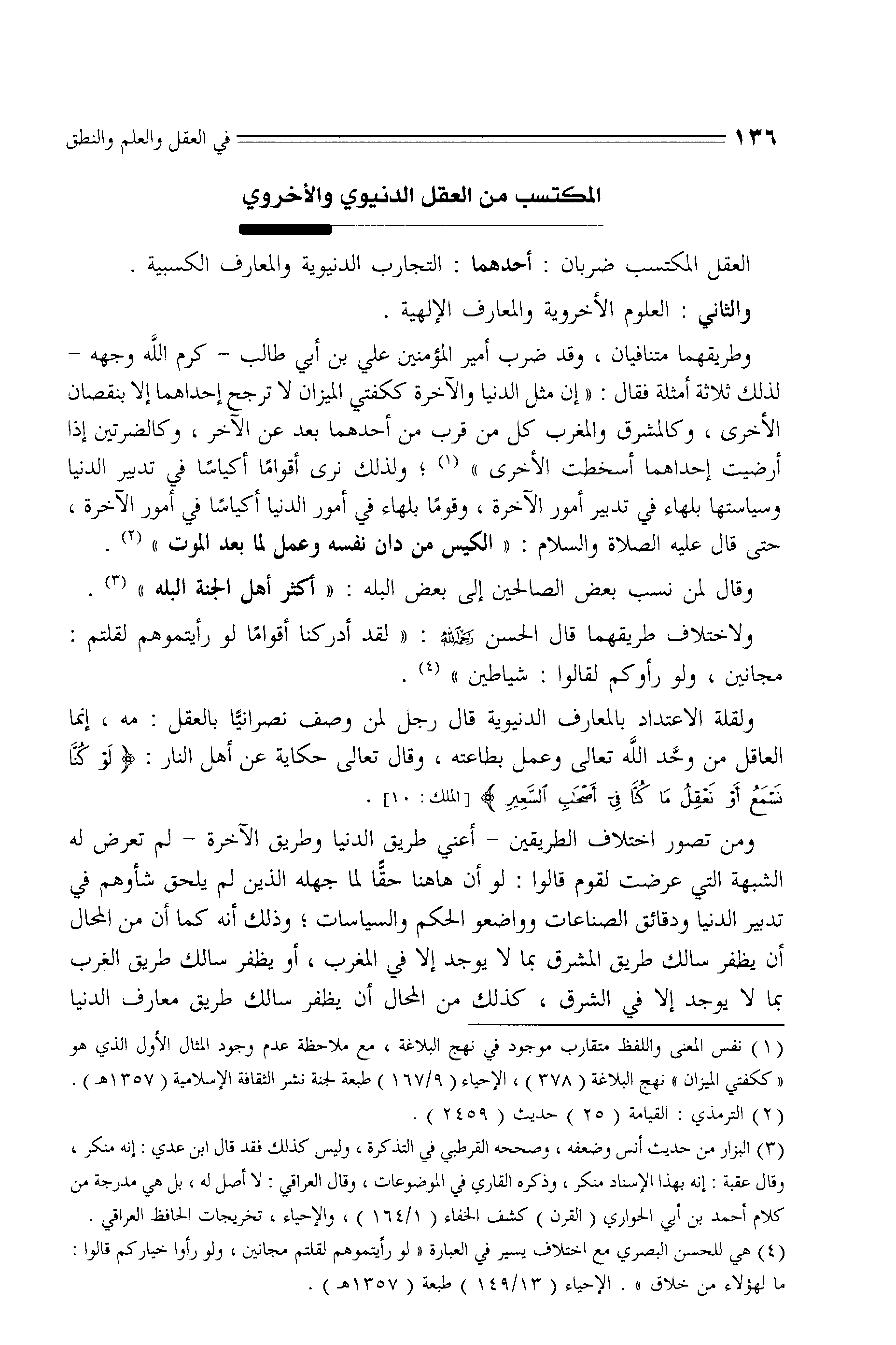 ولقلة الاعتداد بالمعارف الدنيوية قال رجل لمن وصف نصرانيا بالعقل: مه، إنما العاقل من وحَّد اللَّه تعالى وعمل بطاعته، وقال تعالى حكاية عن أهل النار: (لَوْ كُنَّا نَسْمَعُ أَوْ نَعْقِلُ مَا كُنَّا فِي أَصْحَابِ السَّعِيرِ (10) .