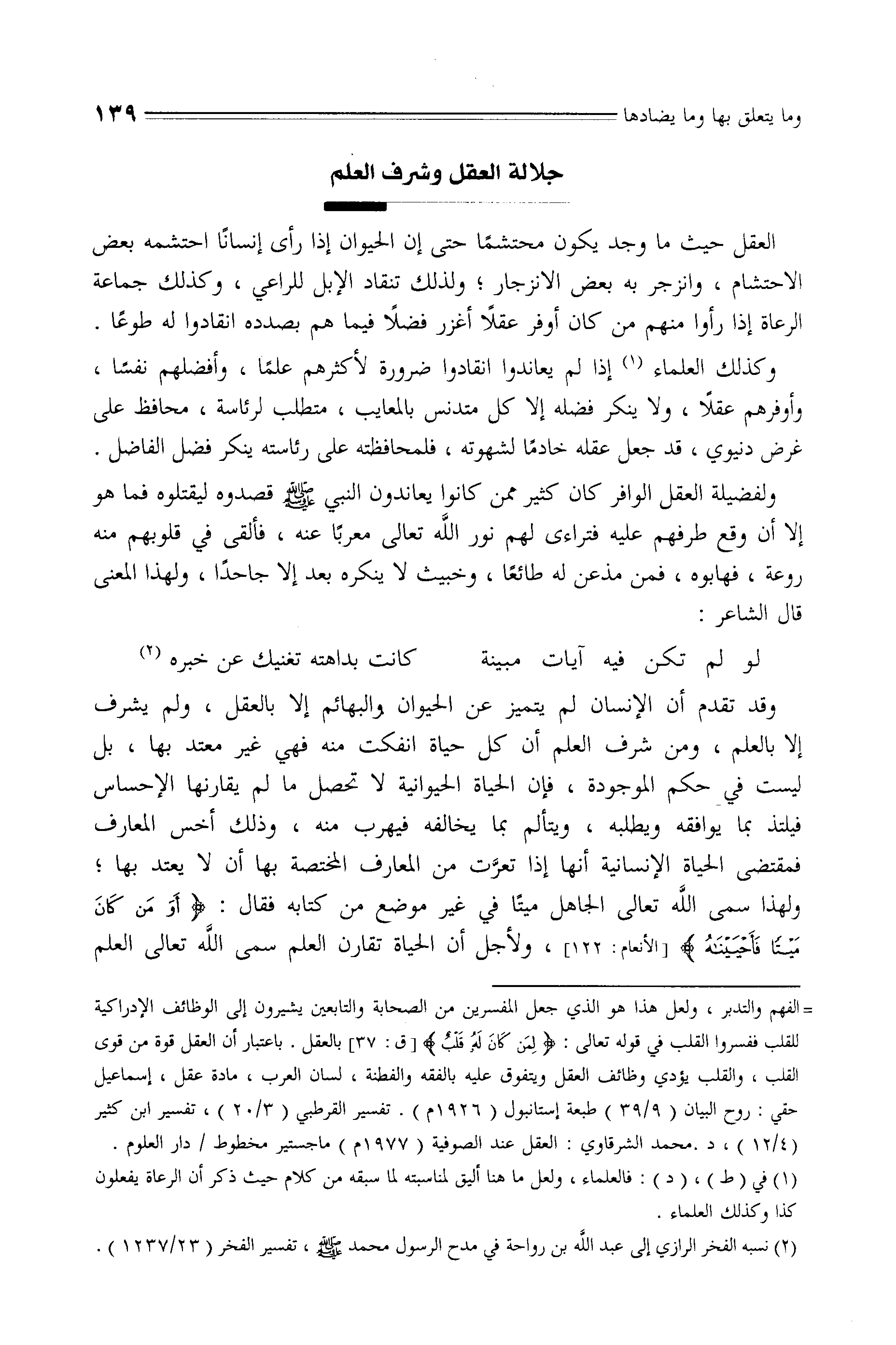 العقل حيث ما وجد يكون محتشمًا حتى إن الحيوان إذا رأى إنسانًا احتشمه بعض الاحتشام، وانزجر به بعض الانزجار، ولذلك تنقاد الإبل للراعي، وكذلك جماعة الرعاة إذا رأوا منهم من كان أوفر عقلًا أغزر فضلًا فيما هم بصدده انقادوا له طوعا.