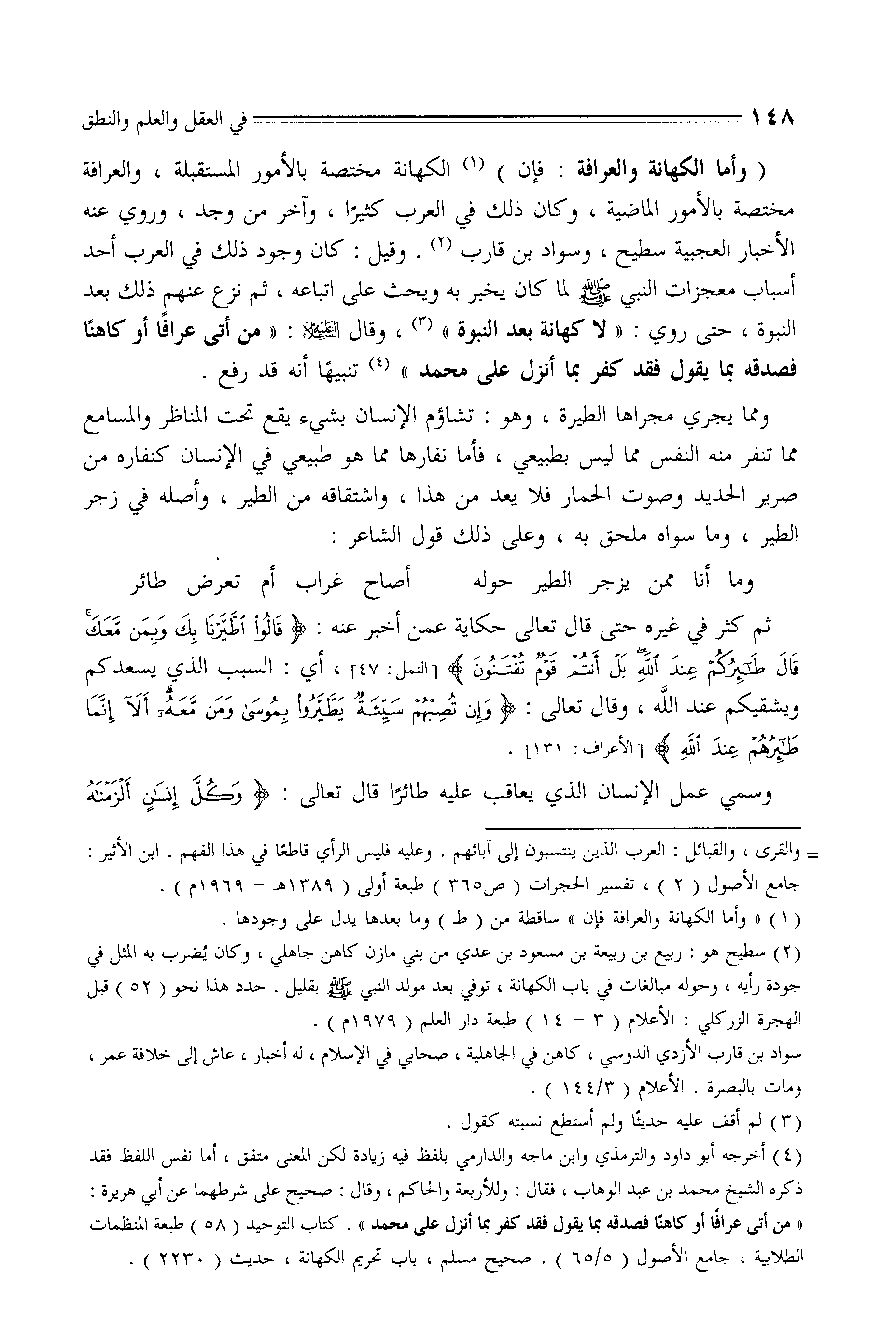 مختصة بالأمور الماضية، وكان ذلك في العرب كثيرًا، وآخر من وجد، وروي عنه الأخبار العجبية سطيح، وسواد بن قارب. وقيل: كان وجود ذلك في العرب أحد أسباب معجزات النبي - صلى الله عليه وسلم - لما كان يخبر به ويحث على اتباعه، ثم نزع عنهمِ ذلك بعد النبوة، حتى روي: " لا كهانة بعد النبوة "، وقال - صلى الله عليه وسلم -: " من أتى عرافَا أو كاهنًا فصدقه بما يقول فقد كفر بما أنزل على محمد " تنبيها أنه قد رفع.