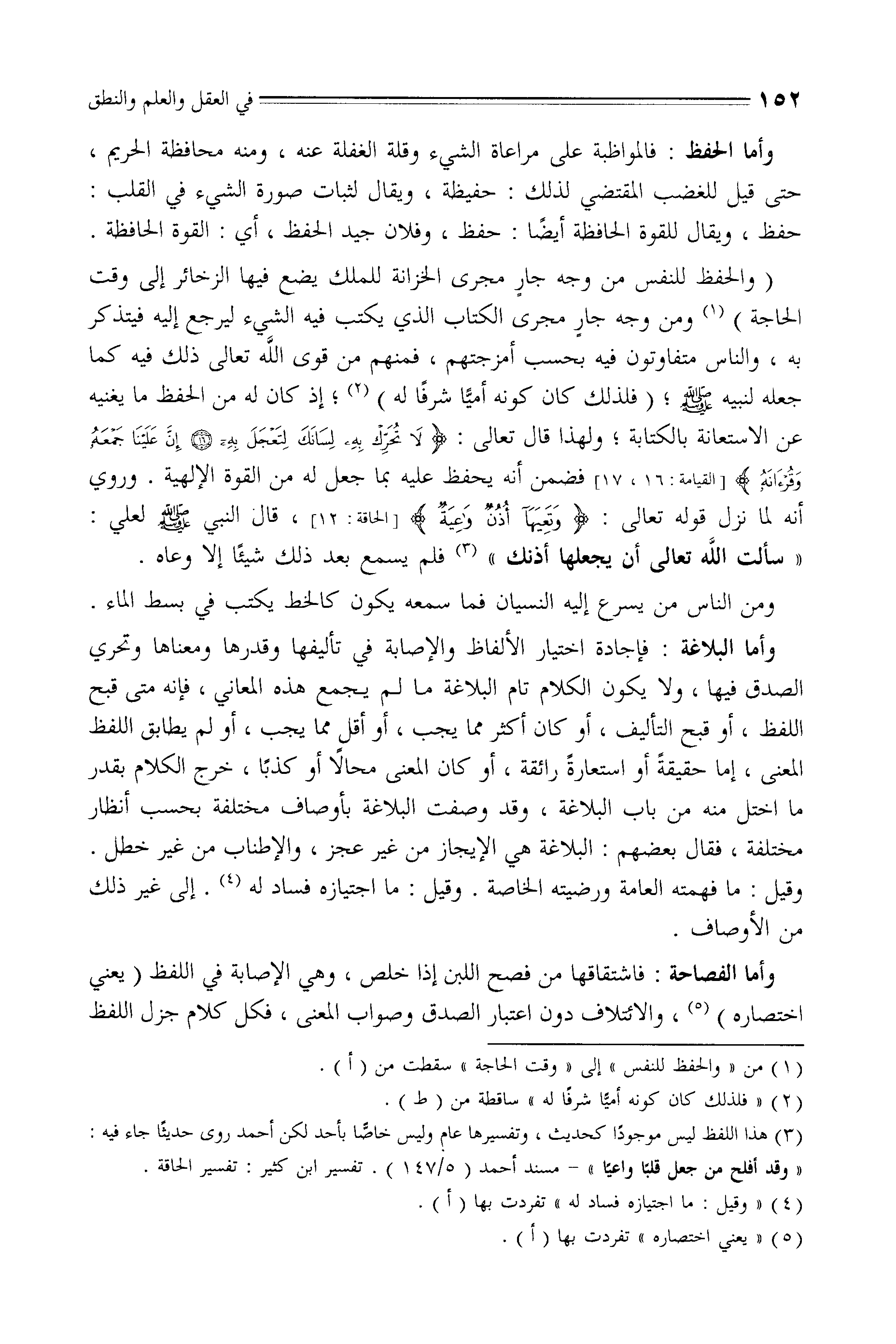 والحفظ للنفس من وجه جارٍ مجرى الخزانة للملك يضمع فيها الزخائر إلى وقت الحاجة) ومن وجه جارٍ مجرى الكتاب الذي يكتب فيه الشيء ليرجع إليه فيتذكر به، والناس متفاوتون فيه بحسب أمزجتهم، فمنهم من قوى الله تعالى ذلك فيه كما جعله لنبيه - صلى الله عليه وسلم -، (فلذلك كان كونه أميًا شرفًا له) ، إذ كان له من الحفظ ما يغنيه عن الاستعانة بالكتابة، ولهذا قال تعالى: (لَا تُحَرِّكْ بِهِ لِسَانَكَ لِتَعْجَلَ بِهِ (16) إِنَّ عَلَيْنَا جَمْعَهُ وَقُرْآنَهُ (17)