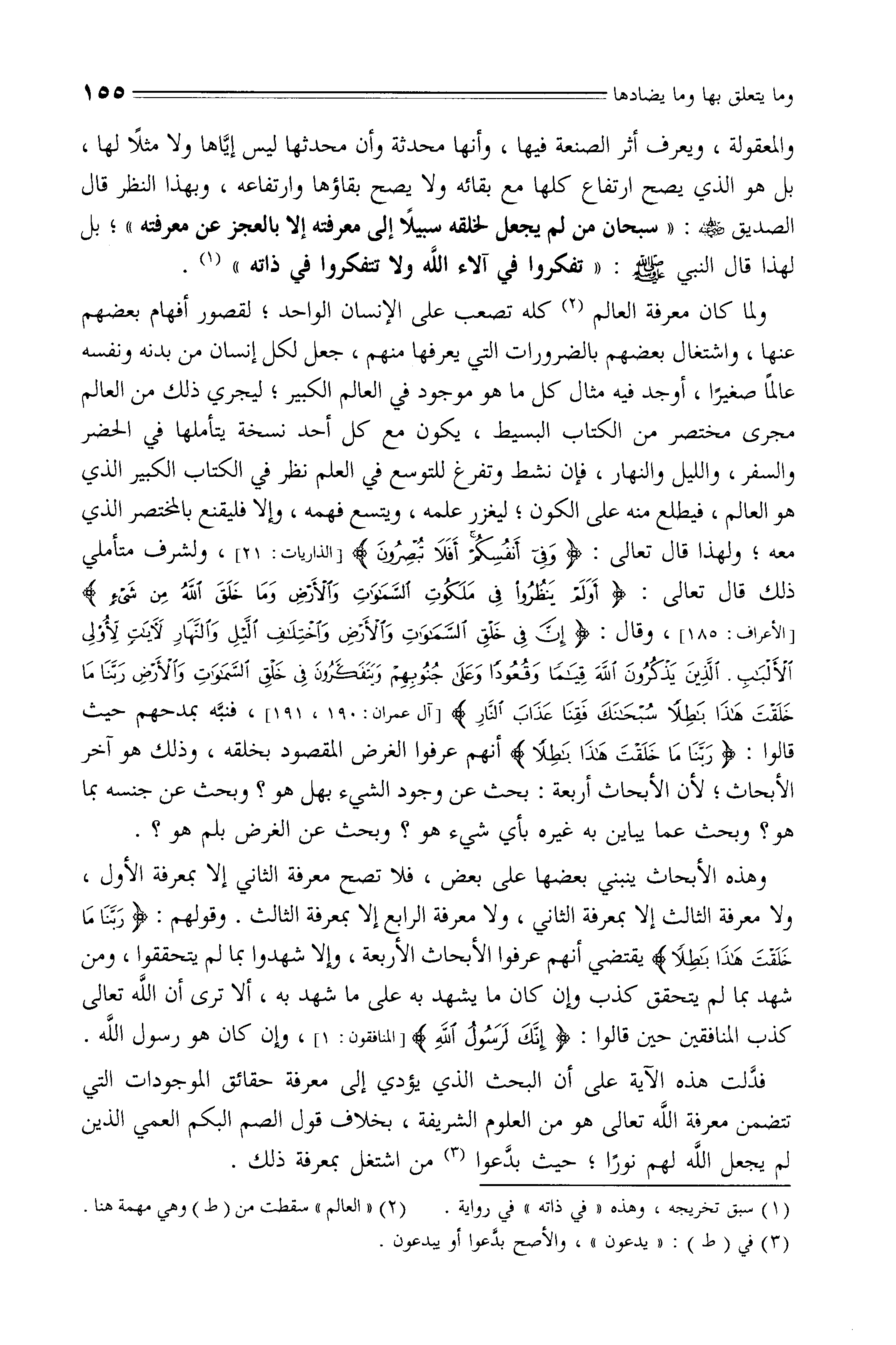 وهذه الأبحاث ينبني بعضها على بعض، فلا تصح معرفة الثاني إلا بمعرفة الأول، ولا معرفة الثالث إلا بمعرفة الثانىِ، ولا معرفة الرابع إلا بمعرفة الثالث. وقوله: (رَبَّنَا مَا خَلَقْتَ هَذَا بَاطِلًا) يقتضي أنهم عرفوا الأبحاث الأربعة، وإلا شهدوا بما لم يتحققوا، ومن شهد بما لم يتحقق كذب وإن كان ما يشهد به على ما شهد به، ألا ترى أن اللَّه تعالى كذب المنافقين حين قالوا: (إِنَّكَ لَرَسُولُ اَللَّهِ)