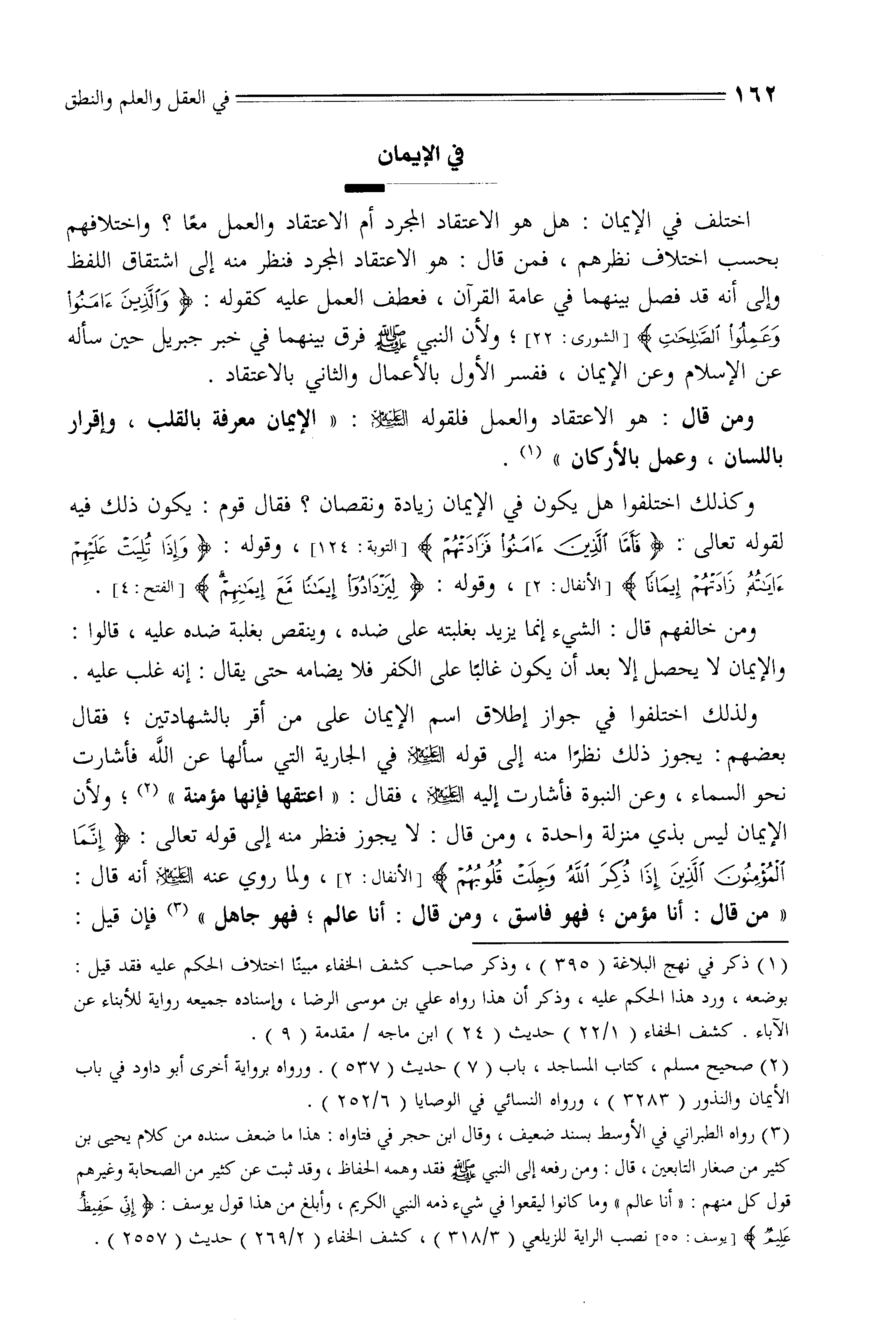 وكذلك اختلفوا هل يكون في الإيمان زيادة ونقصان، فقال قوم: يكون ذلك فيه لقوله تعالى.: (فَأَمَّا الَّذِينَ آمَنُوا فَزَادَتْهُمْ)