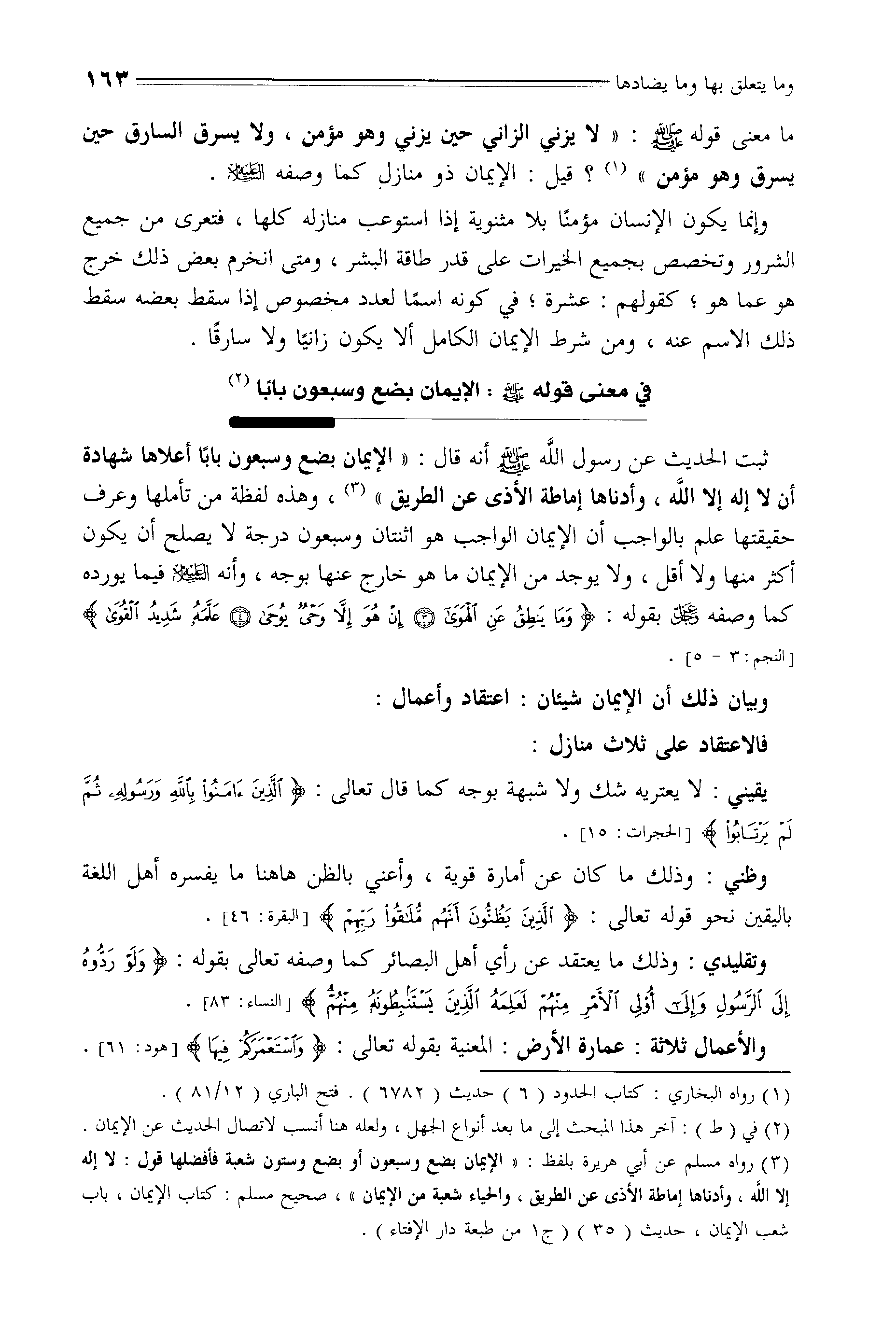 ثبت الحديث عن رسول اللَّه - صلى الله عليه وسلم - أنه قال: " الإيمان بضع وسبعون بابًا أعلاها شهادة أن لا إله إلا اللَّه، وأدناها إماطة الأذى عن الطريق "، وهذه لفظة من تأملها وعرف حقيقتها علم بالواجب أن الإيمان الواجب هو اثنتان وسبعون درجة لا يصلح أن يكون أكثر منها ولا أقل، ولا يوجد من الإيمان ما هو خارج عنها بوجه، وأنه - صلى الله عليه وسلم - فيما يورده كما وصفه - عز وجل - بقوله: (وَمَا يَنْطِقُ عَنِ الْهَوَى (3) إِنْ هُوَ إِلَّا وَحْيٌ يُوحَى (4) عَلَّمَهُ شَدِيدُ الْقُوَى (5) .