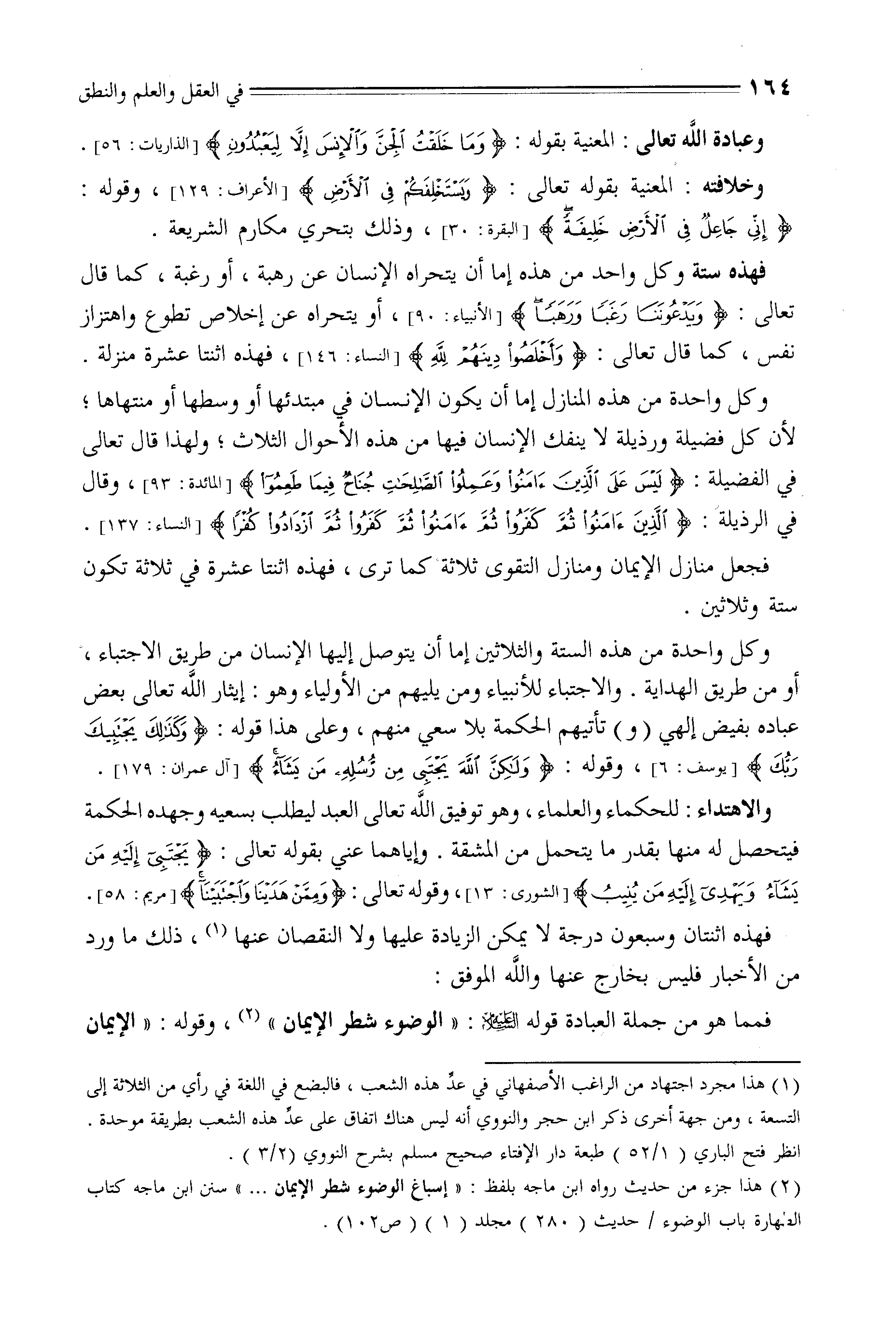 فجعل منازل الإيمان ومنازل التقوى ثلاثة كما ترى، فهذه اثنتا عشرة في ثلاثة تكون ستة وثلاثين.