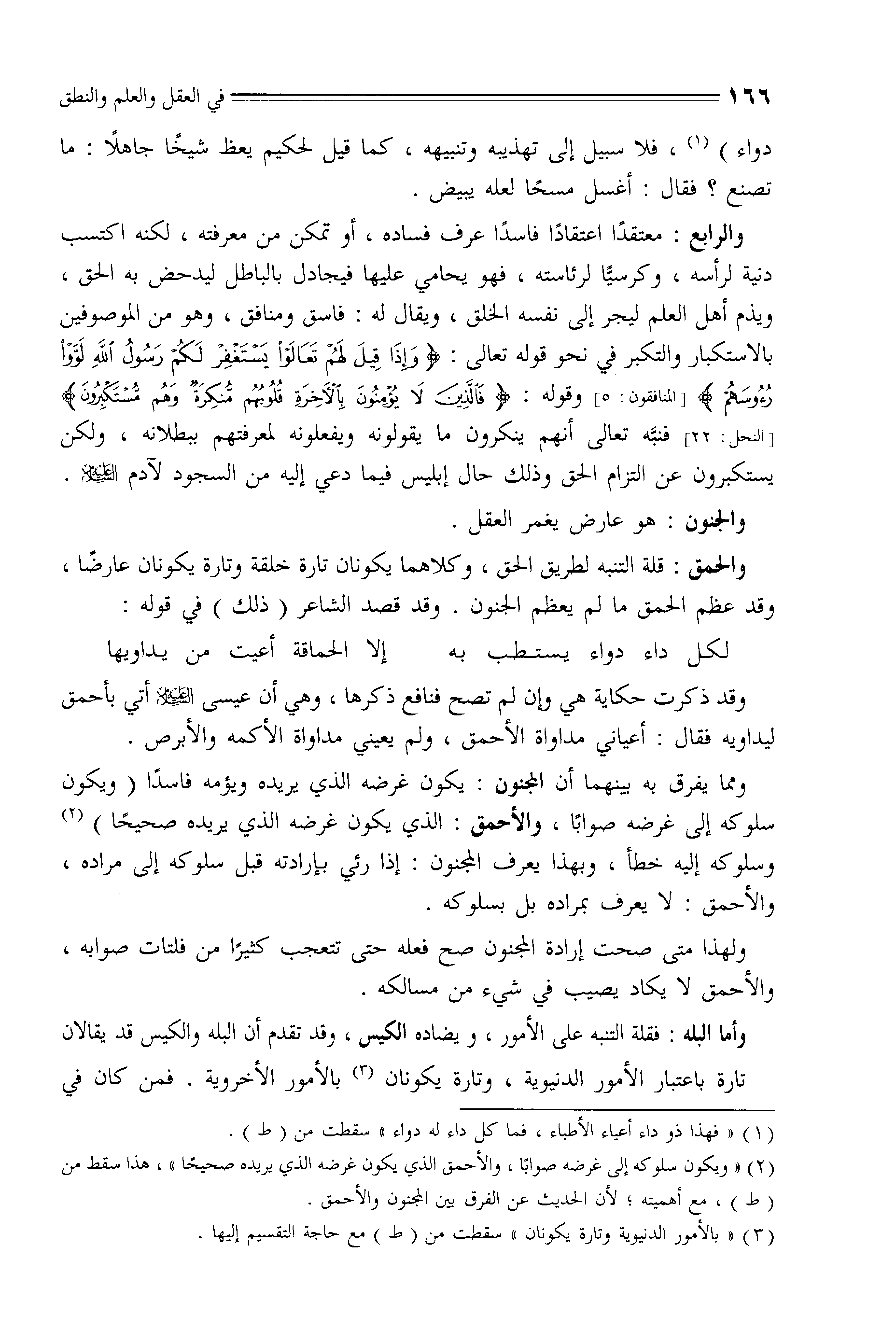 ولهذا متى صحت إرادة المجنون صح فعله حتى تتعجب كثيرًا من فلتات صوابه، والأحمق لا يكاد يصيب في شيء من مسالكه.