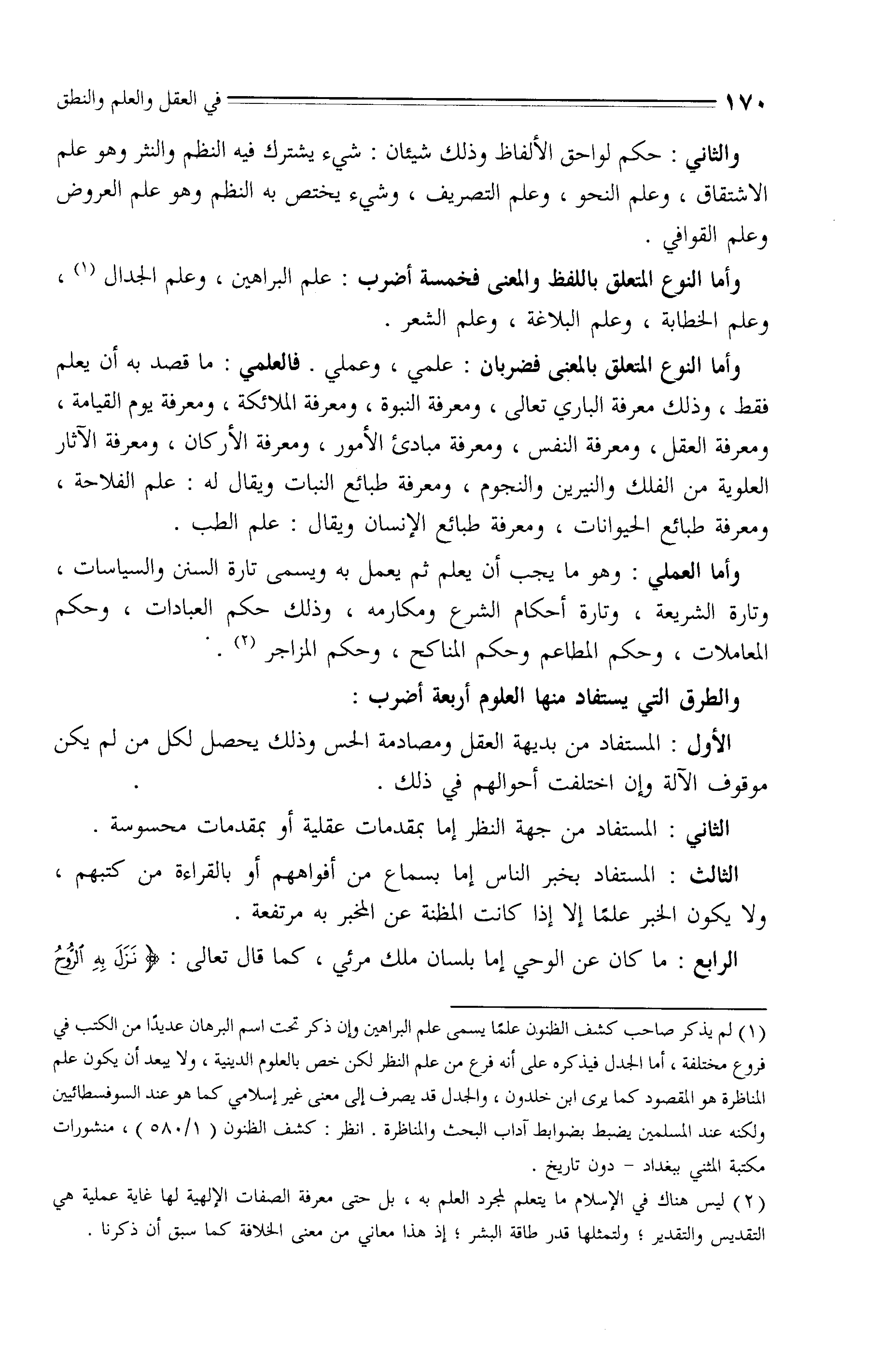 وأما النوع المتعلق باللفظ والمعنى فخمسة أضرب: علم البراهين، وعلم الجدال، وعلم الخطابة، وعلم البلاغة، وعلم الشعر.