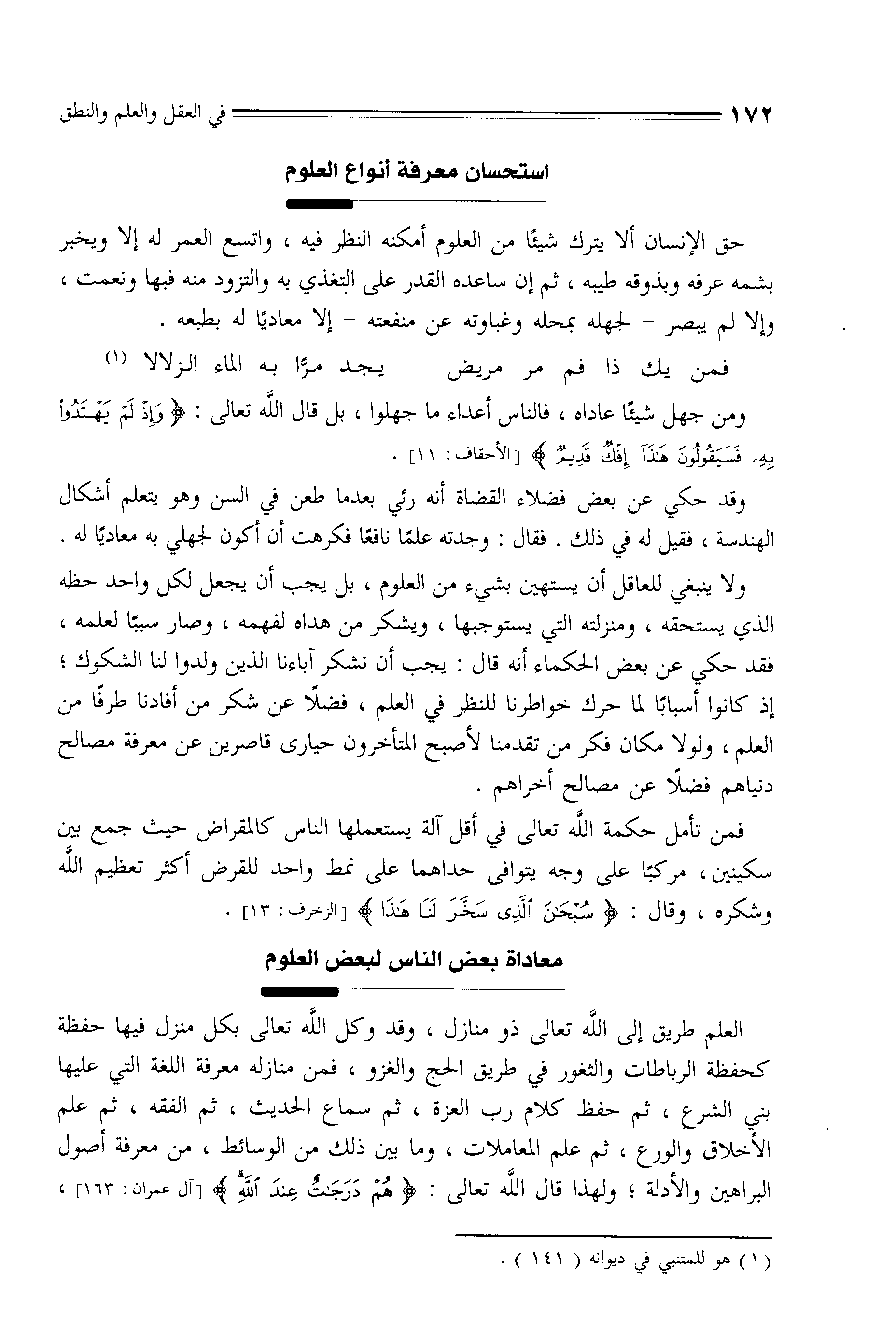 ولا ينبغي للعاقل أن يستهين بشيء من العلوم، بل يجب أن يجعل لكل واحد حظه الذي يستحقه، ومنزلته التي يستوجبها، ويشكر من هداه لفهمه، وصار سببا لعلمه، فقد حكي عن بعض الحكماء أنه قال: يجب أن نشكر آباءنا الذين ولدوا لنا الشكوك؛ إذ كانوا أسبابًا لما حرك خواطرنا للنظر في العلم، فضلًا عن شكر من أفادنا طرفًا من العلم، ولولا مكان فكر من تقدمنا لأصبح المتأخرون حيارى قاصرين عن معرفة مصالح دنياهم فضلًا عن مصالح أخراهم.