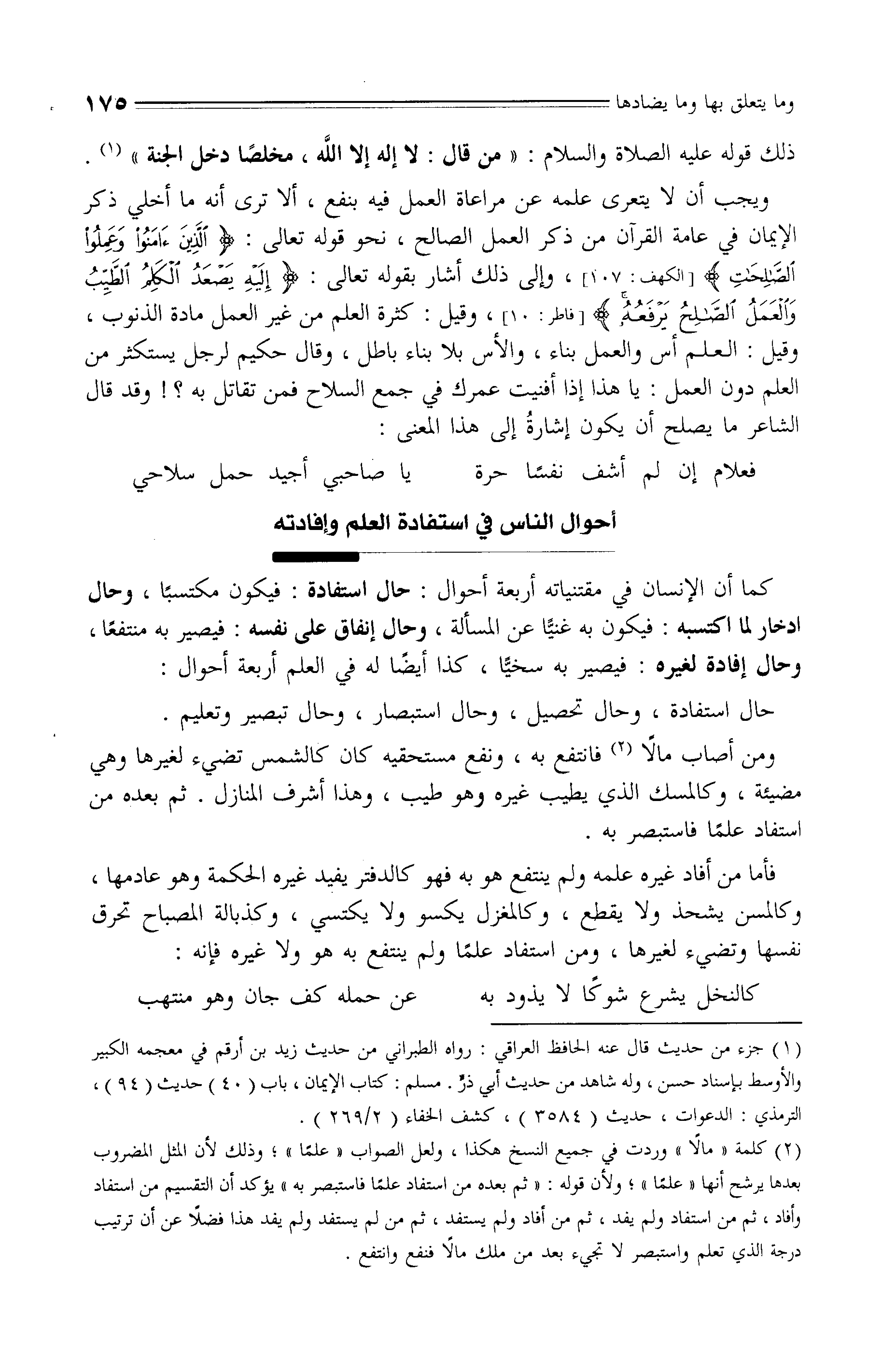 ويجب أن لا يتعرى علمه عن مراعاة العمل فيه بنفع، ألا ترى أنه ما أخلي ذكر الإيمان في عامة القرآن من ذكر العمل الصالح، نحو قوله تعالى: (الَّذِينَ آمَنُوا وَعَمِلُوا الصَّالِحَاتِ)