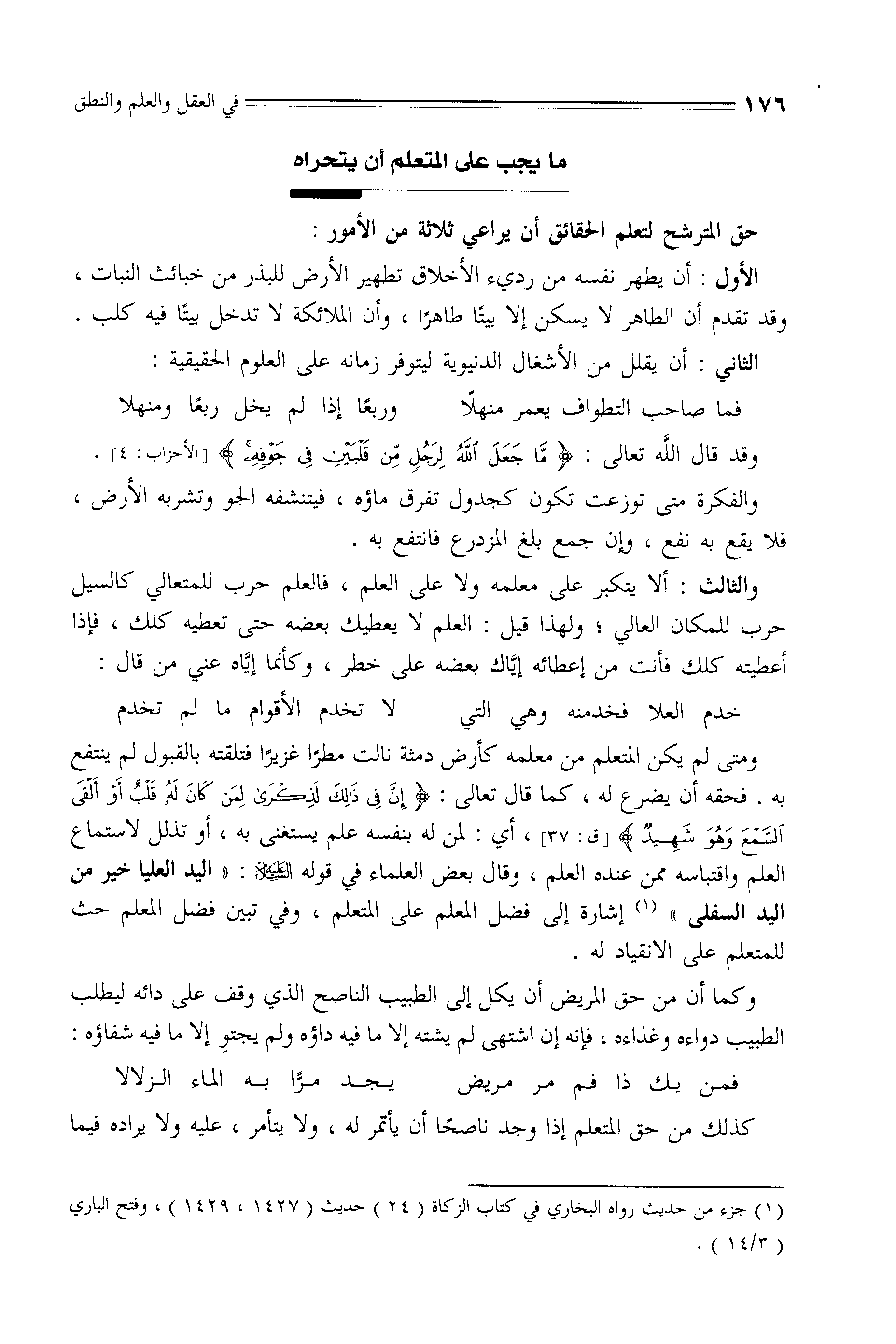 العلم واقتباسه ممن عنده العلم، وقال بعض العلماء في قوله - صلى الله عليه وسلم -: " اليد العليا خير من اليد السفلى " إشارة إلى فضل المعلم على المتعلم، وفي تبين فضل المعلم حث للمتعلم على الانقياد له.