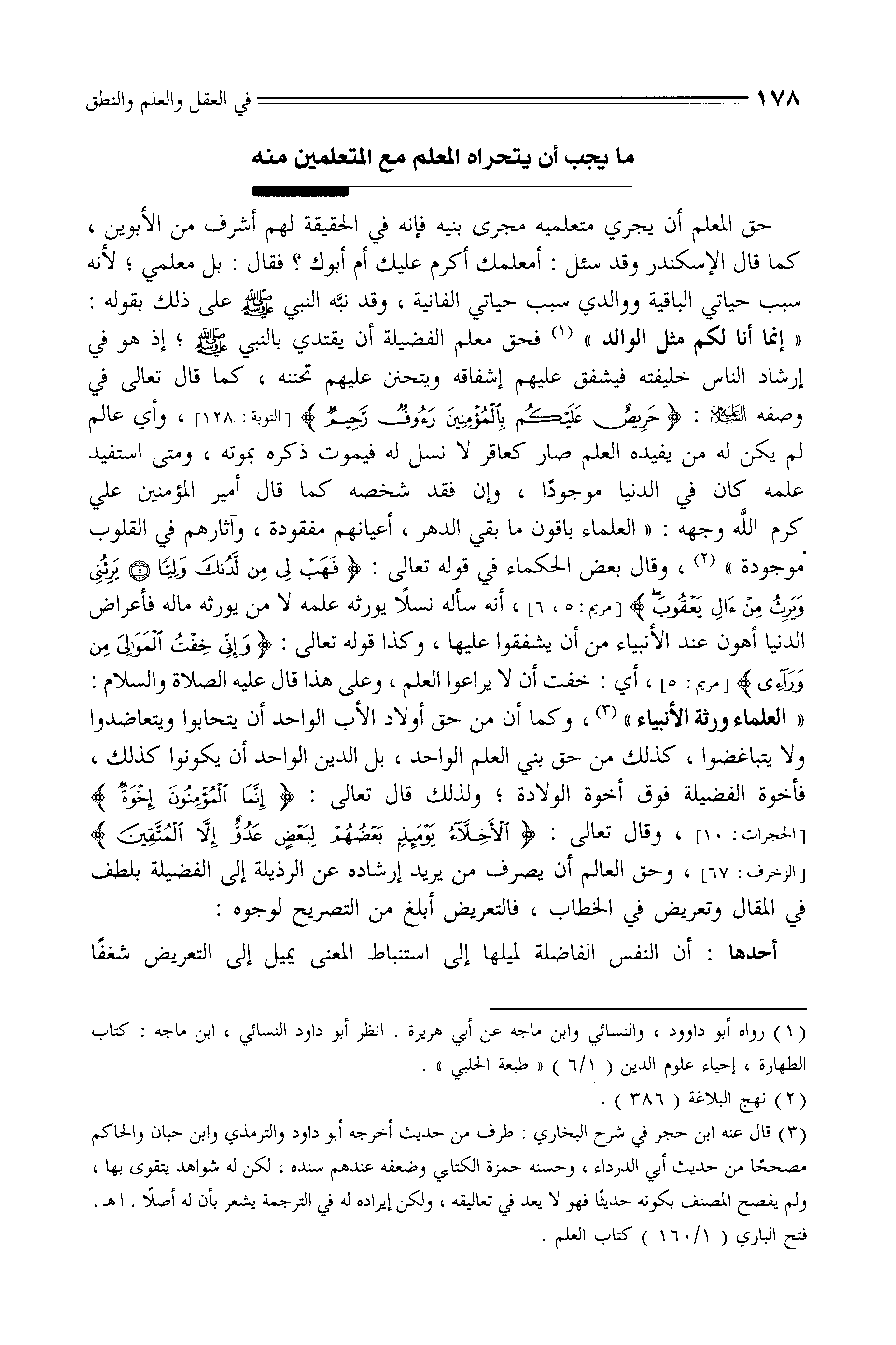 كما قال الإسكندر وقد سئل: أمعلمك أكرم عليك أم أبوك، فقال: بل معلمي؛ لأنه سبب حياتي الباقية ووالدي سبب حياتي الفانية، وقد نبَّه النبي - صلى الله عليه وسلم - على ذلك بقوله: " أنا لكم مثل الوالد " فحق معلم الفضيلة أن يقتدي بالنبي - صلى الله عليه وسلم -؛ إذ هو في