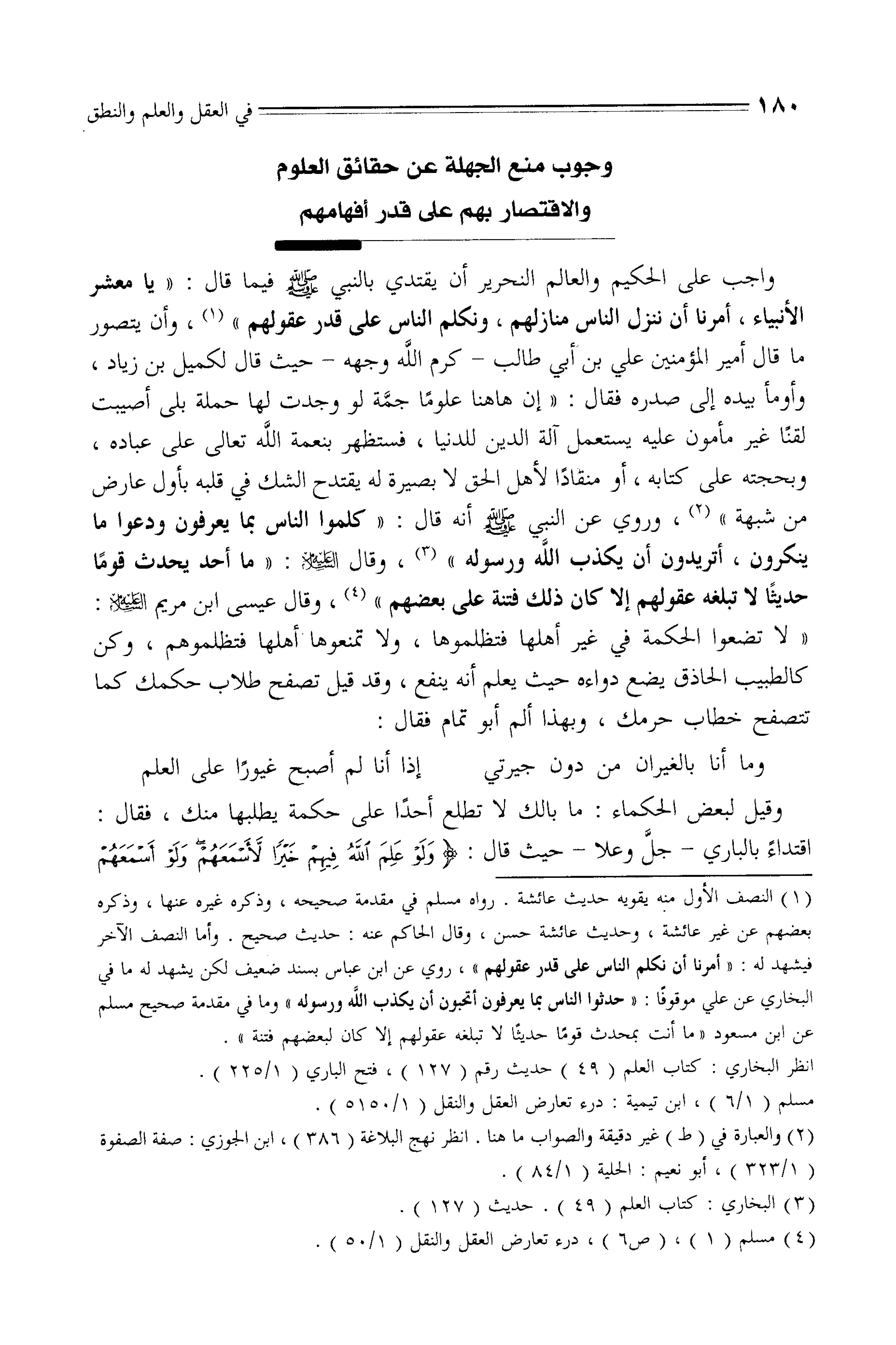 وروي عن النبي - صلى الله عليه وسلم - أنه قال: " كلموا الناس بما يعرفون ودعوا ما ينكرون، أتريدون أن يكذب اللَّه ورسوله "، وقال - صلى الله عليه وسلم -: " ما أحد يحدث قومًا حديثًا لا تبلغه عقولهم إلا كان ذلك فتنة على بعضهم "، وقال عيسى ابن مريم - صلى الله عليه وسلم -: " لا تضعوا الحكمة في غير أهلها فتظلموها، ولا تمنعوها أهلها فتظلموهم، وكن كالطبيب الحاذق يضع دواءه حيث يعلم أنه ينفع، وقد قيل تصفح طلاب حكمك كما تتصفح خطاب حرمك،
