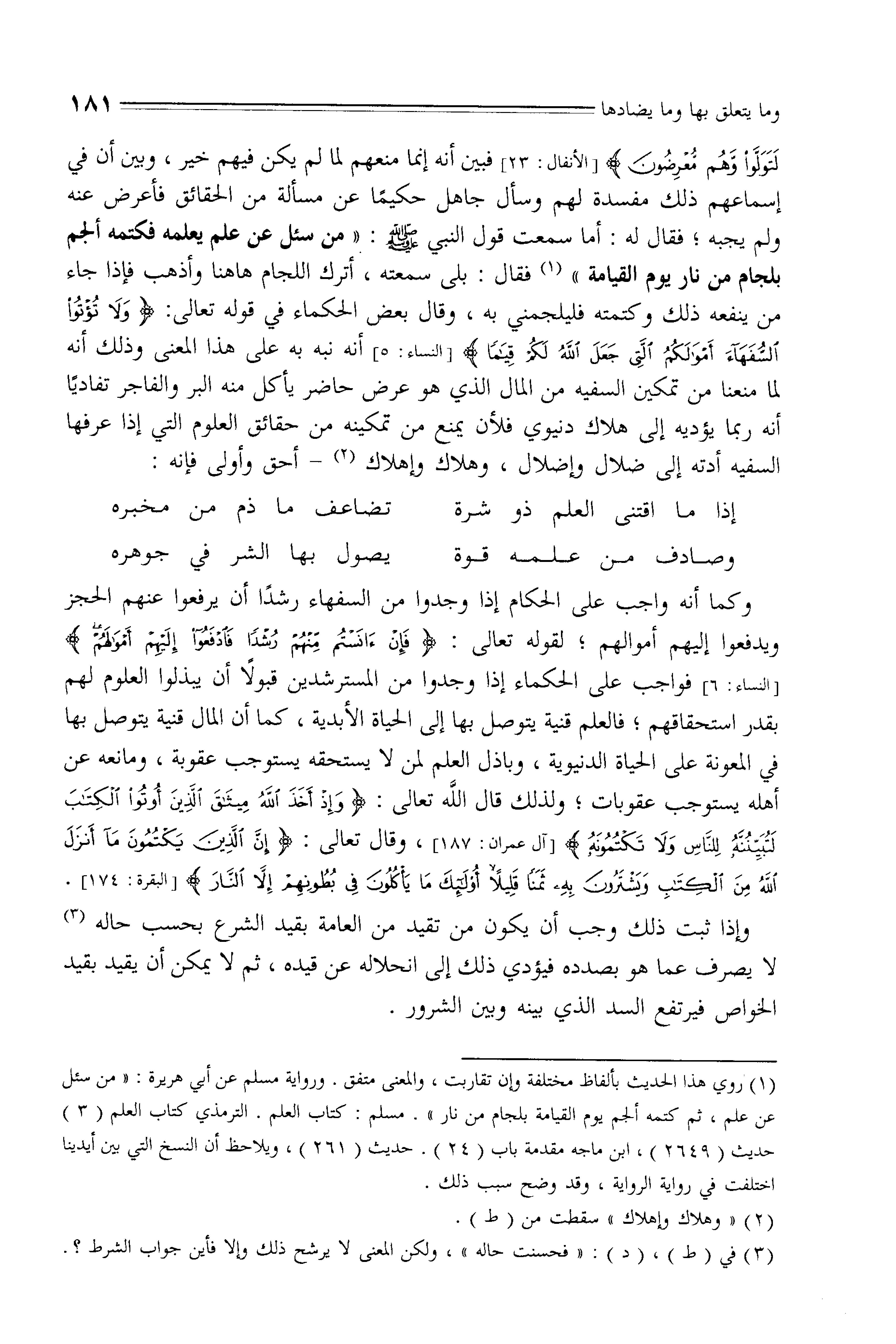 ولم يجبه، فقال له: أما سمعت قول النبي - صلى الله عليه وسلم -: " من سئل عن علم يعلمه فكتمه ألجم بلجام من نار يوم القيامة " فقال: بلى سمعته، أترك اللجام هاهنا وأذهب فإذا جاء من ينفعه ذلك وكتمته فليلجمني به، وقال بعض الحكماء في قوله تعالى: (وَلَا تُؤْتُوا السُّفَهَاءَ أَمْوَالَكُمُ الَّتِي جَعَلَ اللَّهُ لَكُمْ قِيَامًا) أنه نبه به على هذا المعنى وذلك أنه