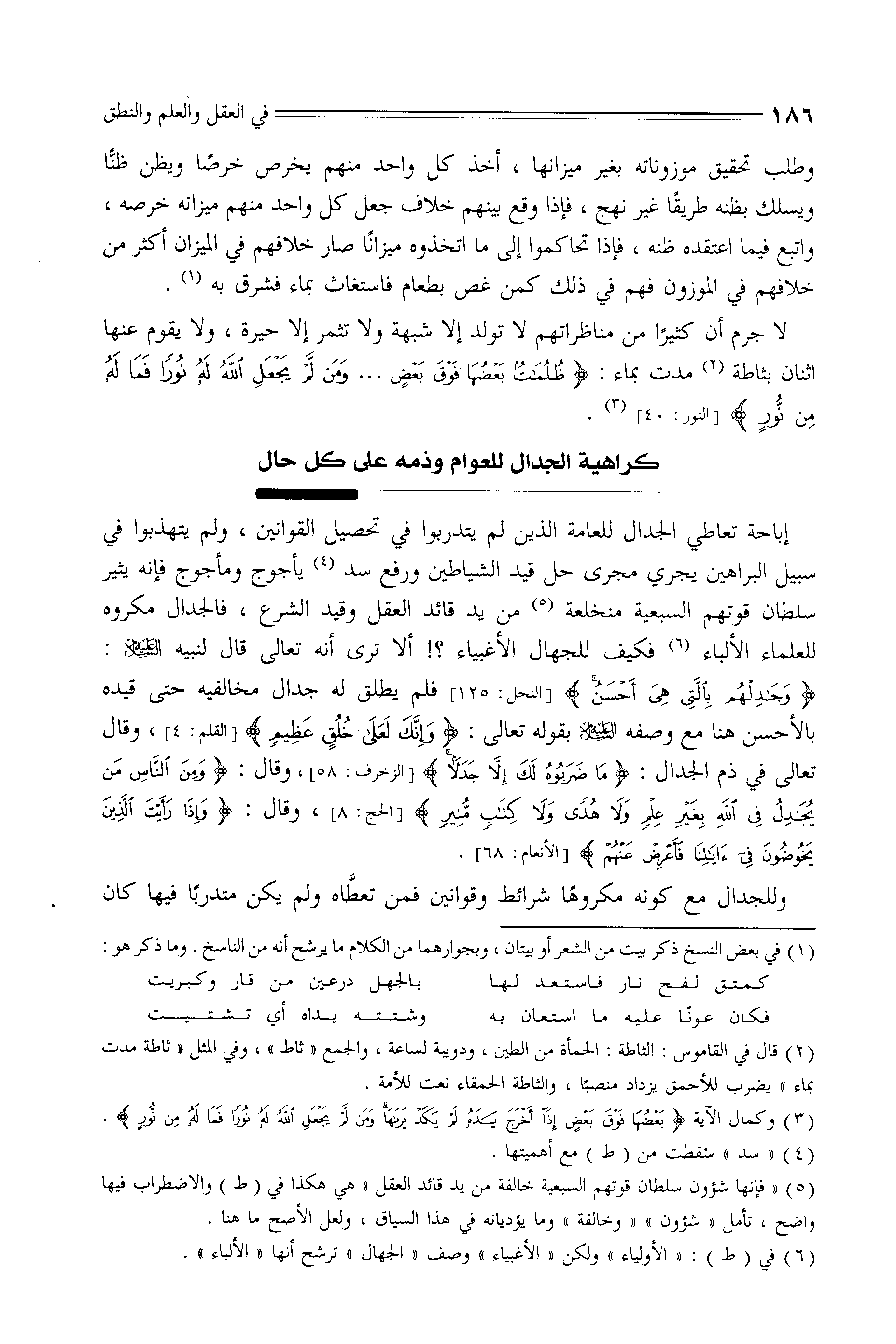 سبيل البراهين يجري مجرى حل قيد الشياطين ورفع سد يأجوج ومأجوج فإنه يثير سلطان قوتهم السبعية منخلعة من يد قائد العقل وقيد الشرع، فالجدال مكروه للعلماء الألباء فكيف للجهال الأغبياء؟! ألا ترى أنه تعالى قال لنبيه - صلى الله عليه وسلم -: (وَجَادِلْهُمْ بِالَّتِي هِيَ أَحْسَنُ)