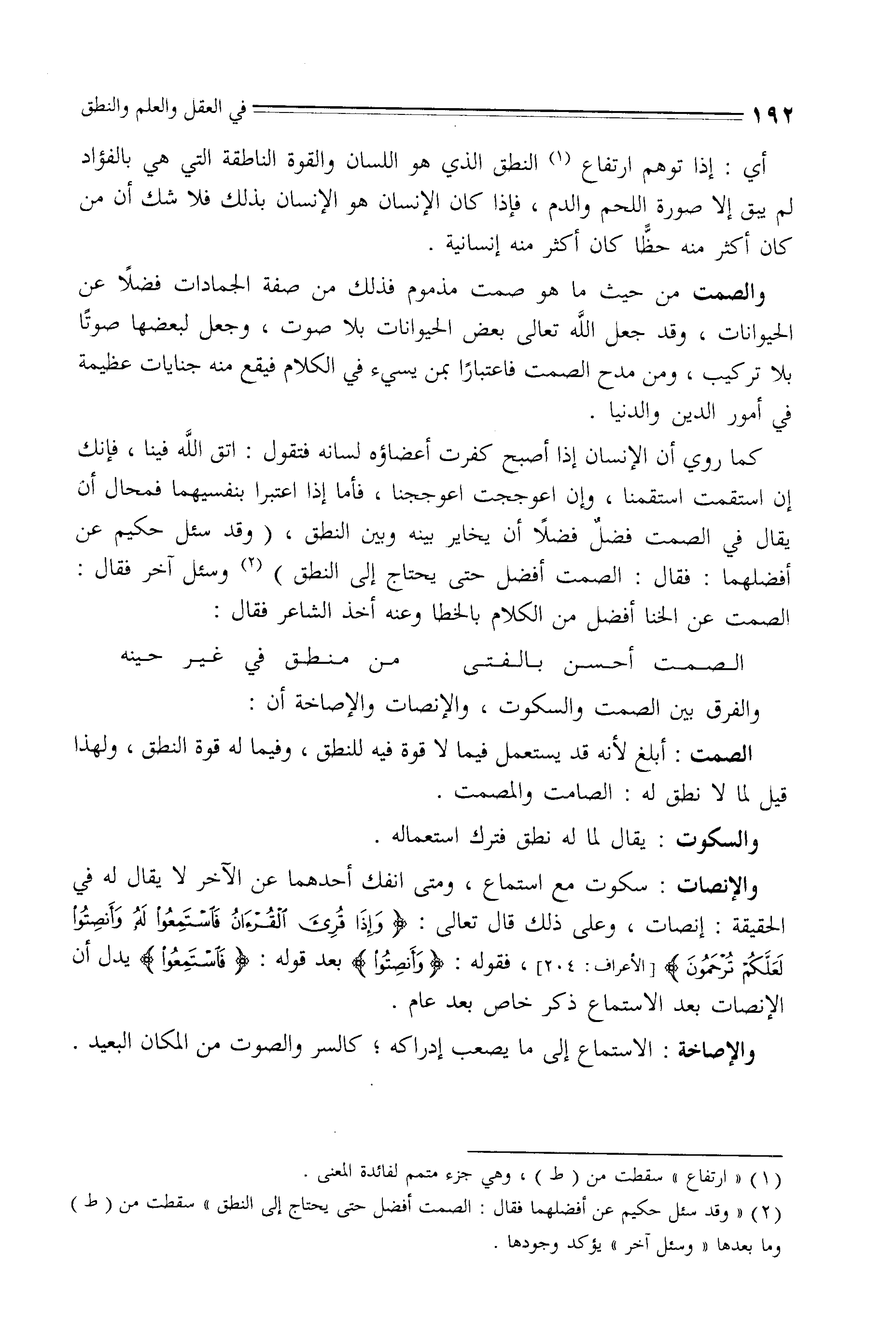 الحيوانات، وقد جعل اللَّه تعالى بعض الحيوانات بلا صوت، وجعل لبعضها صوتًا بلا تركيب، ومن مدح الصمت فاعتبارًا بمن يسيء في الكلام فيقع منه جنايات عظيمة في أمور الدين والدنيا.