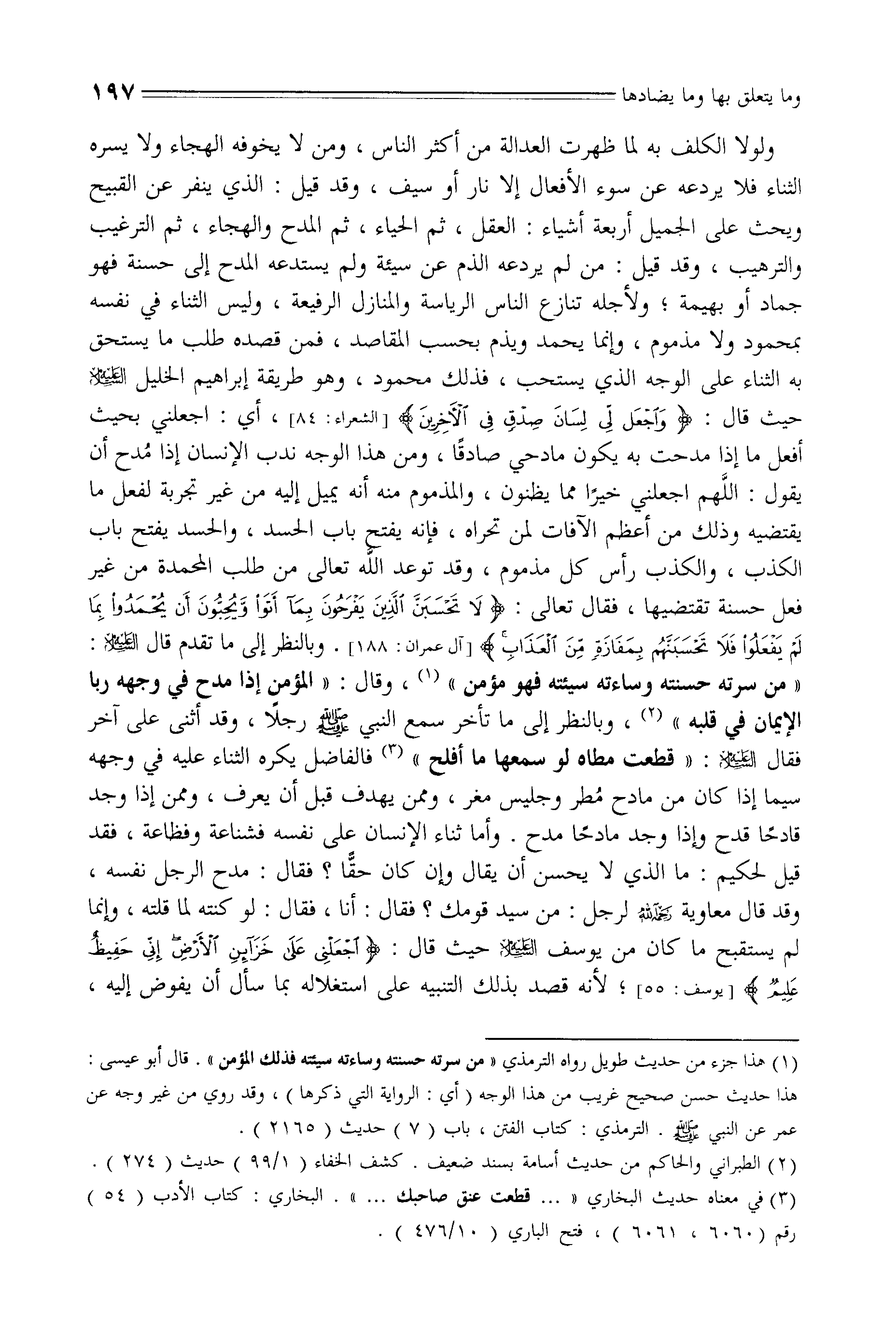 وبالنظر إلى ما تقدم قال - صلى الله عليه وسلم -: " من سرته حسنته وساءته سيئته فهو مؤمن "، وقال: " المؤمن إذا مدح في وجهه ربا