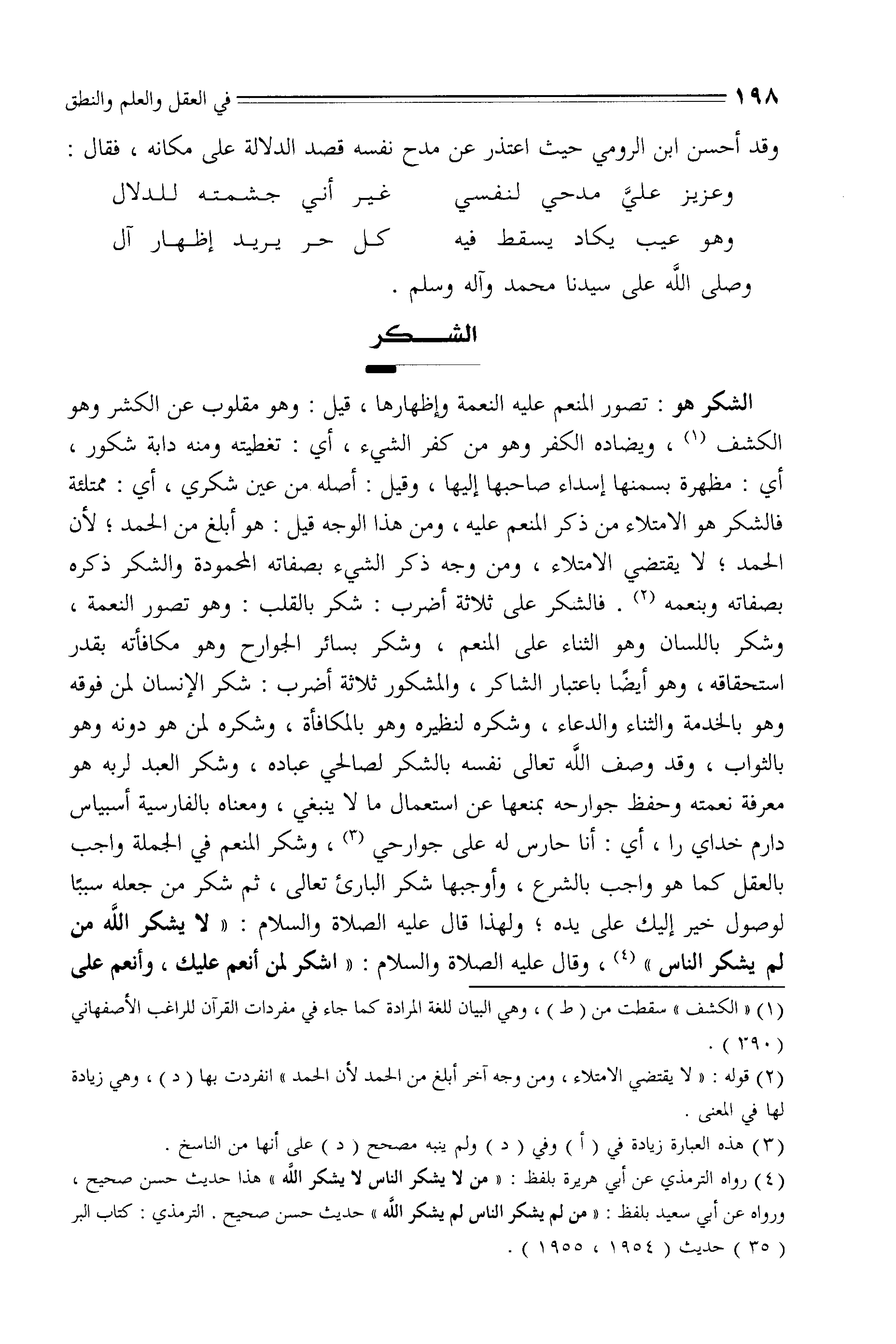 وشكر باللسان وهو الثناء على المنعم، وشكر بسائر الجوارح وهو مكافأته بقدر استحقاقه، وهو أيضًا باعتبار الشاكر، والمشكور ثلاثة أضرب: شكر الإنسان لمن فوقه وهو بالخدمة والثناء والدعاء، وشكره لنظيره وهو بالمكافأة، وشكره لمن هو دونه وهو بالثواب، وقد وصف اللَّه تعالى نفسه بالشكر لصالحي عباده، وشكر العبد لربه هو معرفة نعمته وحفظ جوارحه بمنعها عن استعمال ما لا ينبغي، ومعناه بالفارسية أسبياس دارم خداي را، أي: أنا حارس له على جوارحي، وشكر المنعم في الجملة واجب