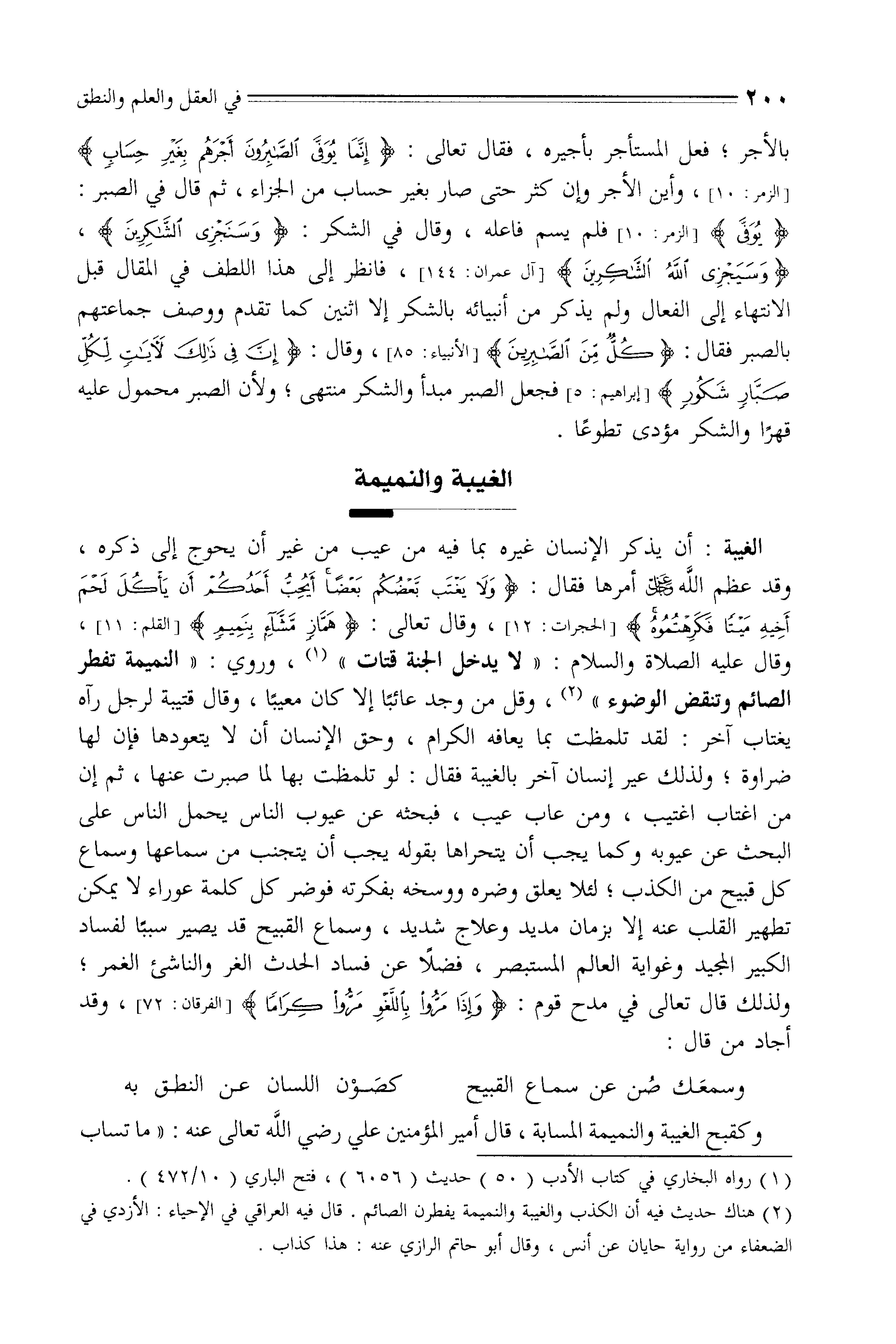 وقال عليه الصلاة والسلام: " لا يدخل الجنة قتات "، وروي: " النميمة تفطر الصائم وتنقض الوضوء "، وقلَّ من وجد عائبًا إلا كان معيبًا، وقال قتيبة لرجل رآه يغتاب آخر: لقد تلمظت بما يعافه الكرام، وحق الإنسان أن لا يتعودها فإن لها ضراوة، ولذلك عير إنسان آخر بالغيبة فقال: لو تلمظت بها لما صبرت عنها، ثم إن من اغتاب اغتيب، ومن عاب عيب، فبحثه عن عيوب الناس يحمل الناس على البحث عن عيوبه وكما يجب أن يتحراها بقوله يجب أن يتجنب من سماعها وسماع كل قبيح من الكذب، لئلا يعلق وضره ووسخه بفكرته فوضر كل كلمة عوراء لا يمكن
