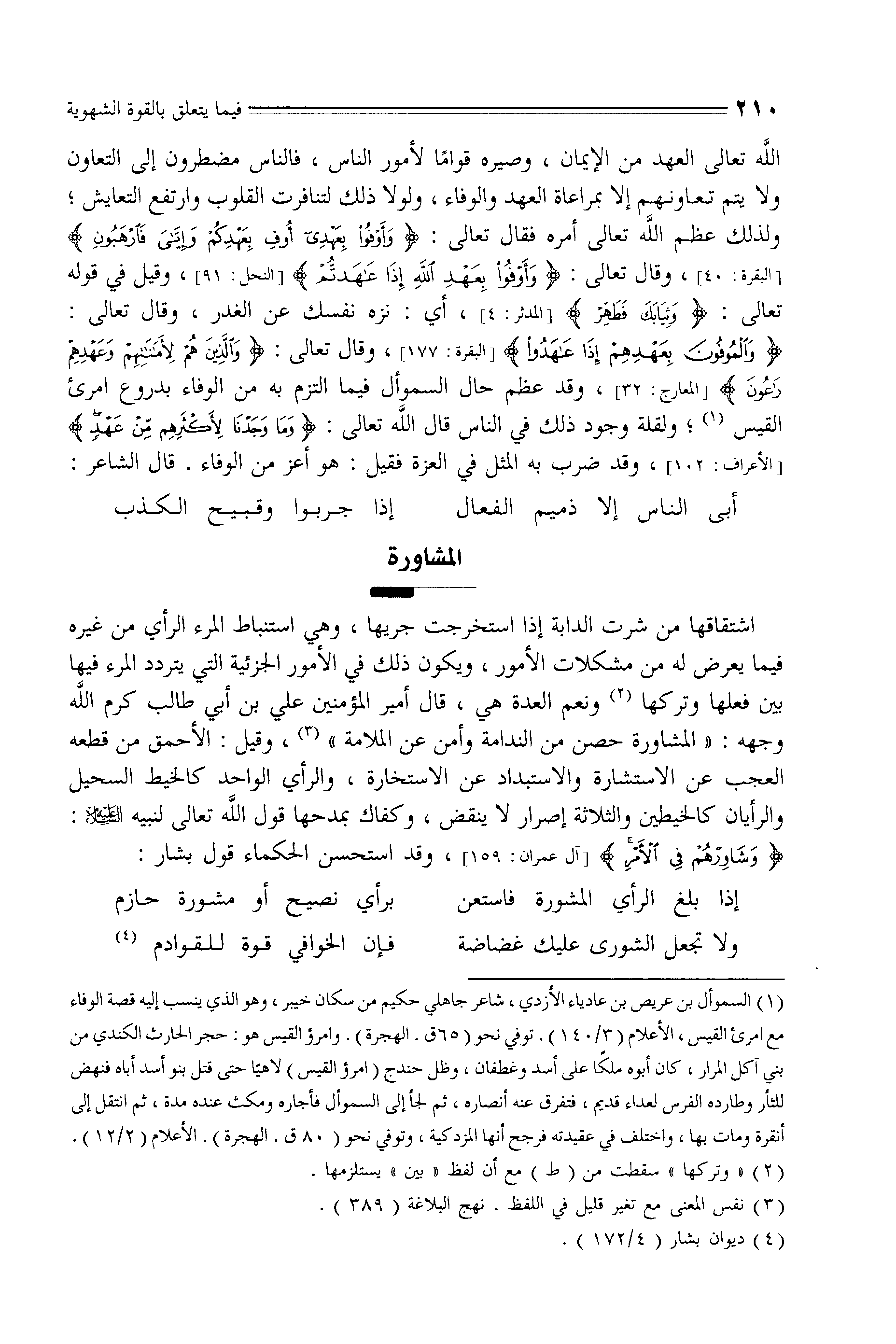 والرأيان كالخيطين والثلاثة إصرار لا ينقض، وكفاك بمدحها قول الله تعالى لنبيه - صلى الله عليه وسلم -: (وَشَاوِرْهُمْ فِي الْأَمْرِ)