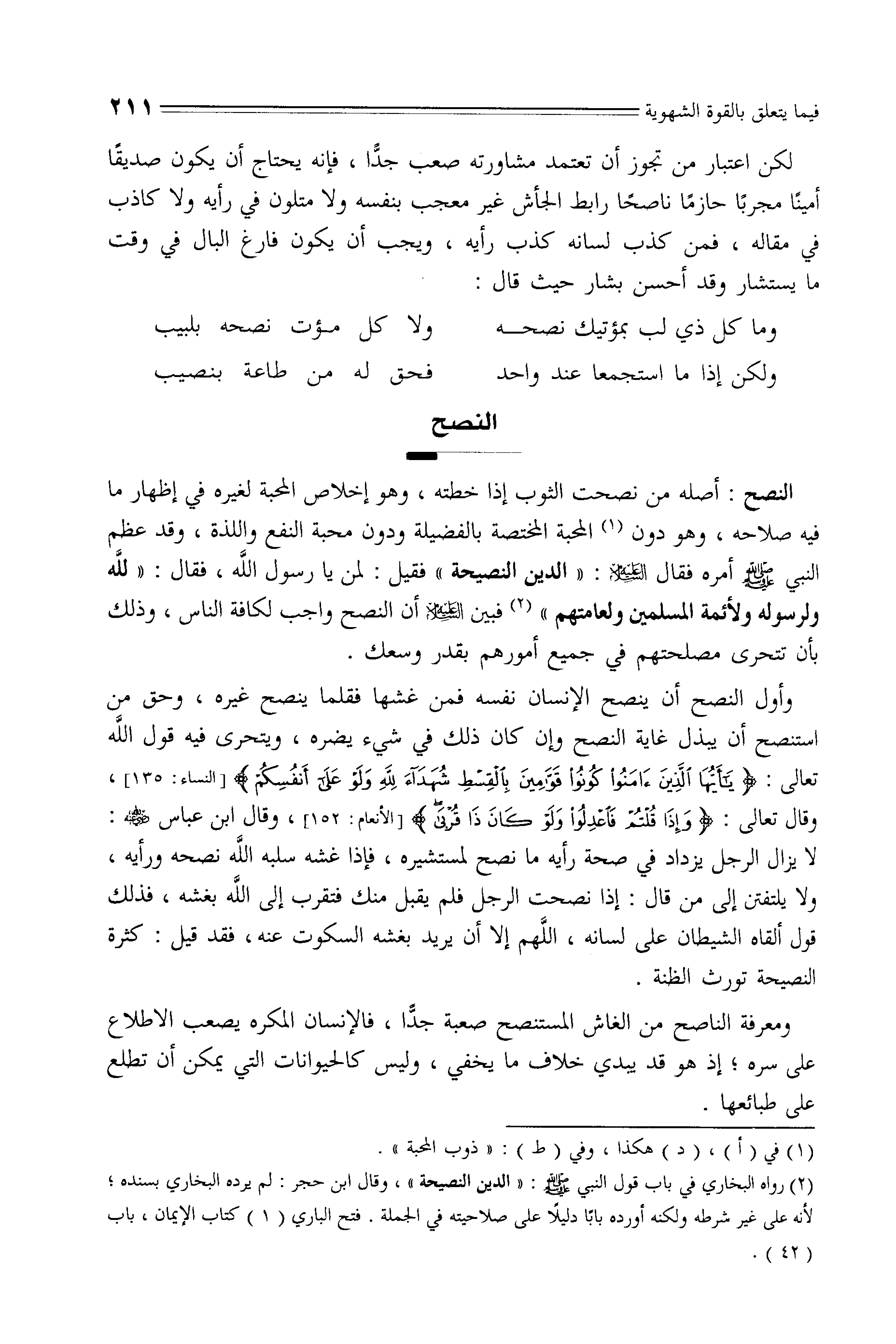 النصح: أصله من نصحت الثوب إذا خطته، وهو إخلاص المحبة لغيره في إظهار ما فيه صلاحه، وهو دون المحبة المختصة بالفضيلة ودون محبة النفع واللذة، وقد عظم النبي - صلى الله عليه وسلم - أمره فقال: " الدين النصيحة " فقيل: لمن يا رسول اللَّه، فقال: " للَّه ولرسوله ولأئمة المسلمين ولعامتهم " فبين - صلى الله عليه وسلم - أن النصح واجب لكافة الناس، وذلك بأن تتحرى مصلحتهم في جميع أمورهم بقدر وسعك.